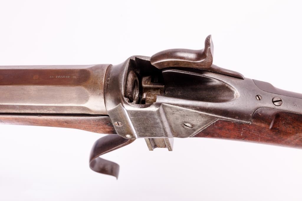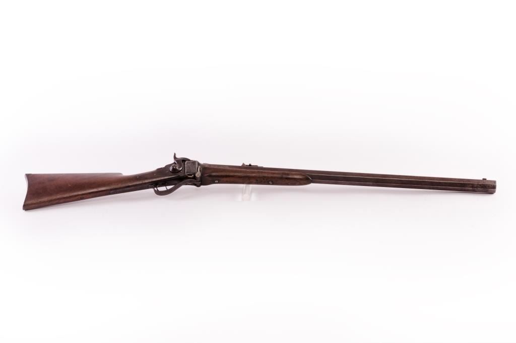 Sharps Model 1874 Sporting rifle, .40 caliber 2-5/8” case, double set triggers (working at time of description), period Davenport 30” heavy octagon barrel (approximately 16 pounds in weight), brown patina, wood stocks, S/N C54001, formerly from the famous Bill Gary Collection (sold by Little John’s in 2014) with factory letter indicating this gun was invoiced to Captain John Mix of the U.S. Army stationed at Fort Laramie, WY on May 6, 1875. Additionally, there is a second 1993-dated letter from Dr. Moore to the late Mr. Gary indicating that Davenport barrels were used by the likes of Walter Cooper and other dealers when a barrel needed changing. Dr. Moore’s letter confirms the identity and placement of the markings. Additionally in the letter from Dr. Moore concerning the Sharps records, it is mentioned that Captain Mix was an Army Officer stationed in several places throughout the West and Northwest and received a dealers discount on many Sporting Rifles that he ordered during the 1870’s. He was apparently selling these to fellow officers or to Western stores not having a dealer status with the Sharps Rifle Company. There is also included a letter from noted collector, the late Gerald Mayberry on this rifle. This Sharps is in overall good to very good condition displaying an even dark brown patina to metal surfaces, crisp action, sharp markings and good bore; the wood is good with an old worn sliver loss at the left front side of the forend. Also included with the documentation are the National Archives service records and other information on Captain Mix who fought in the Civil War followed by years on the frontier during the Indian War period. A very historic and identified Buffalo Gun! (Antique). Est.: $5,000-$10,000.