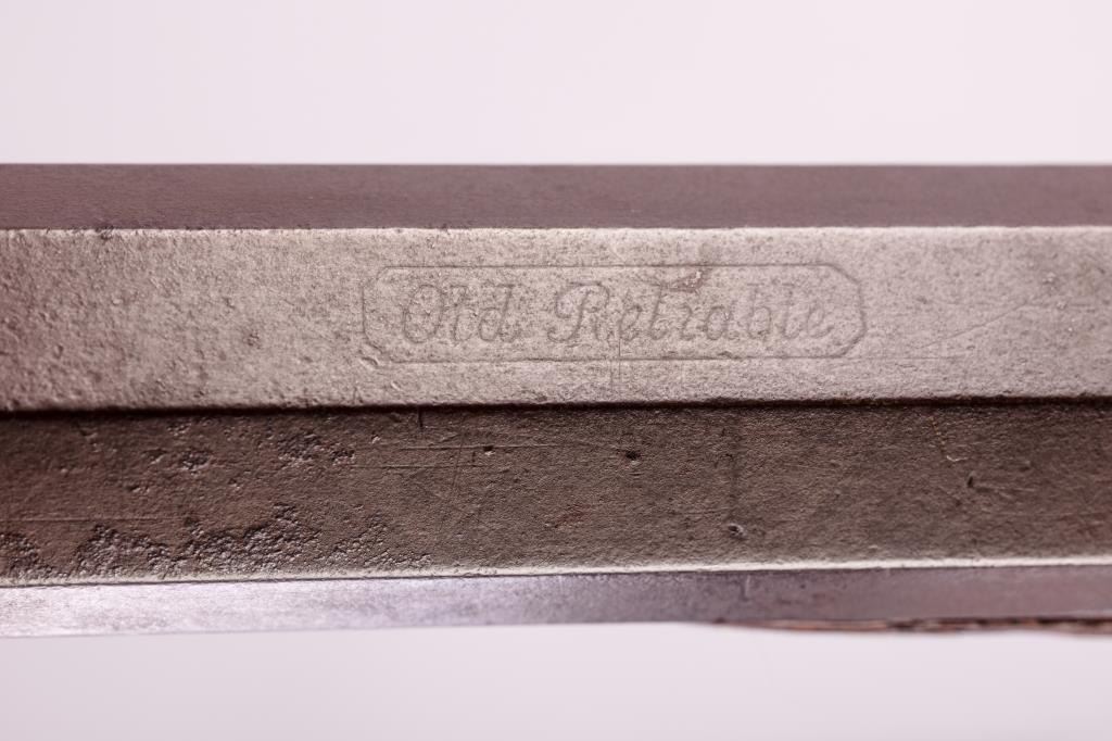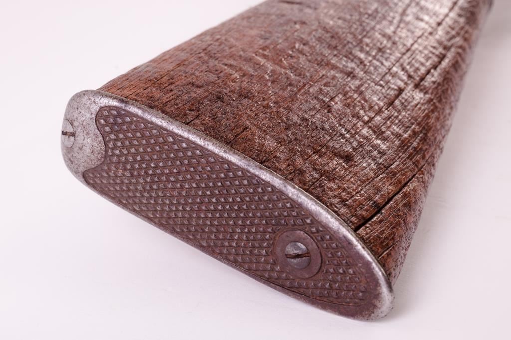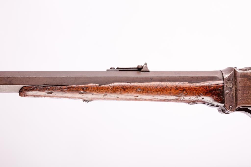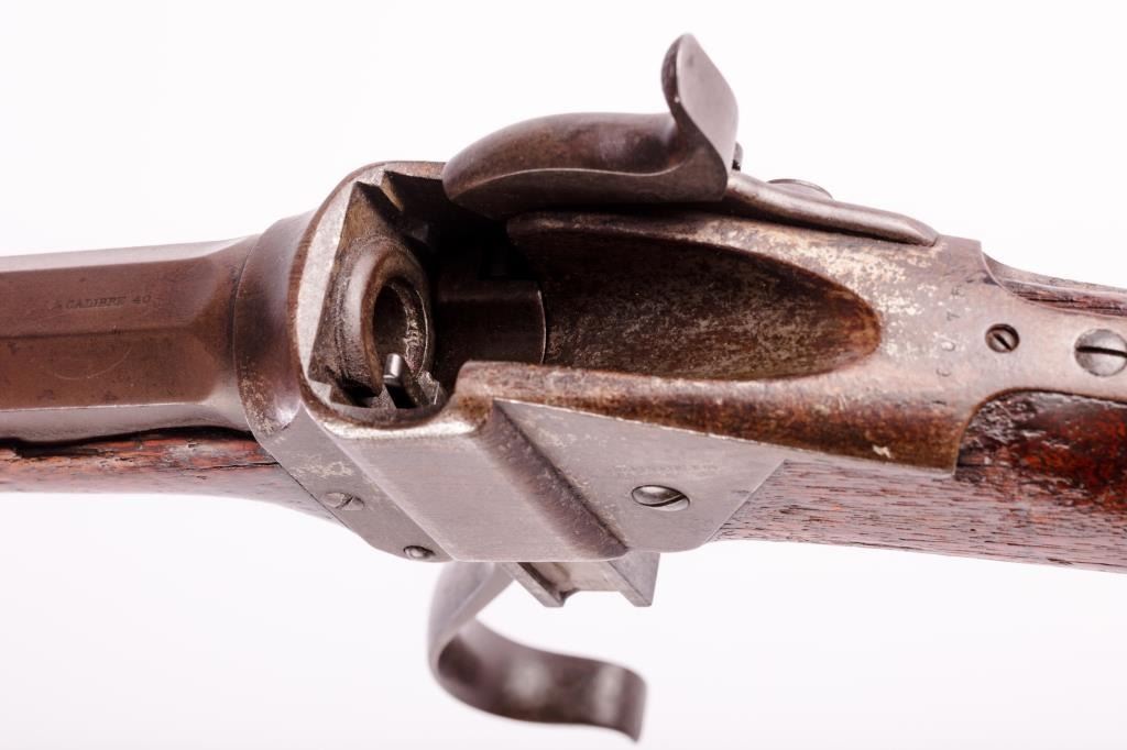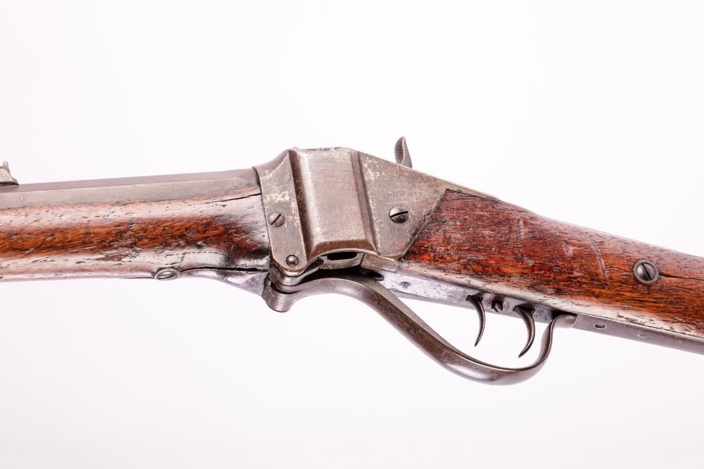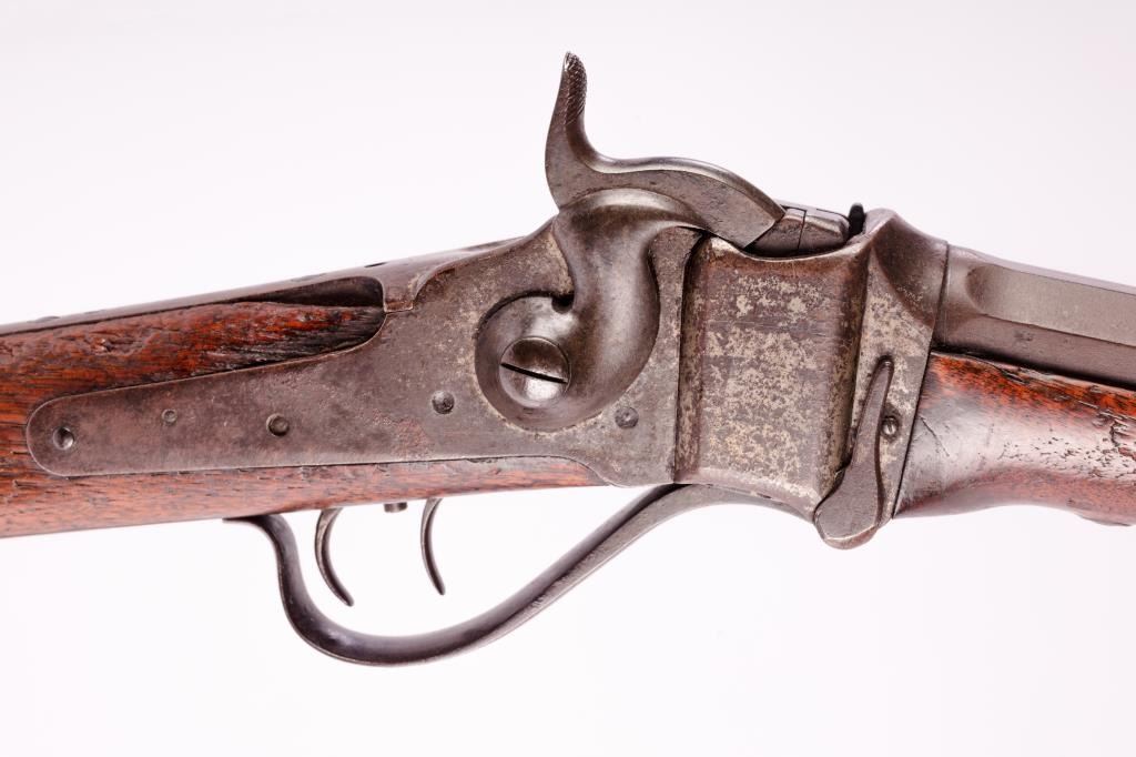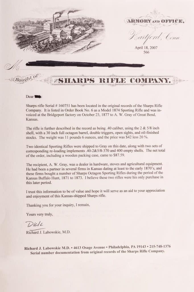 Important historical Sharps Model 1874 Sporting rifle descended in the family of Western lawman and Arizona Ranger C. H. Farnsworth; .40 caliber, 2-5/8” case, 30” octagon barrel, double set triggers (in need of adjustment at time of description), weathered wood stocks, S/N 160751; overall good condition with an even dark brown patina of barrel and receiver with receiver showing some traces of original case colors under the hammer and scattered silver toning; crisp action, good markings and very good bore; butt stock shows classic weathering from carry and exposure to elements; wear to forend and an old pin repair to a crack approximately 4” from the rear right side of the forend. Accompanied by a factory letter noting this rifle was invoiced at the Bridgeport factory on October 23, 1877, to A. W. Gray of Great Bend, Kansas; features are confirmed and weight of gun placed at 11 pounds, 6 ounces. The letter further states that Gray was a dealer in hardware, stoves and agricultural equipment. Provenance: Original letter dated July 19th, 2007 from John Kleinman stating he sold several items he had in his possession from his grandfather, C. H. Farnsworth, to noted collectors Brad Witherell and Richard Burdick. There is also an original letter dated Feb. 16, 2010, from Mr. Burdick confirming he had bought a grouping of items, including this Sharps rifle, from Mr. Kleinman. A great historic Western lawman’s gun directly passed down through his family! (Antique). Est.: $6,000-$12,000.