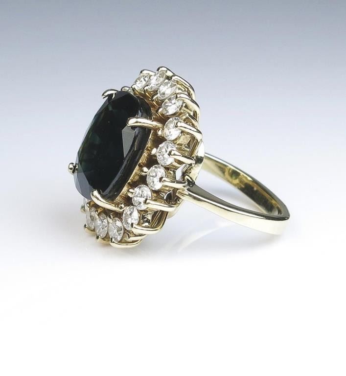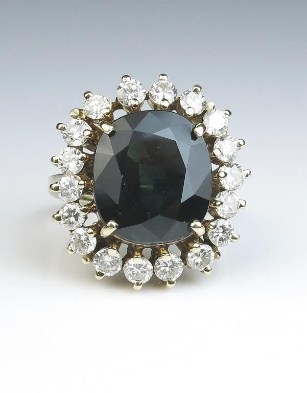 Magnificent Princess Diana style Sapphire and Diamond Ring featuring a Greenish Blue Sapphire weighing approx. 13.00-14.00 carats encircled by 18 round cut Diamonds weighing approx. 2.50 carats total with H-I colors and VS clarity set in 14 karat yellow gold setting. Retail $8,000-$12,000 Estimates $4,000-$6,000