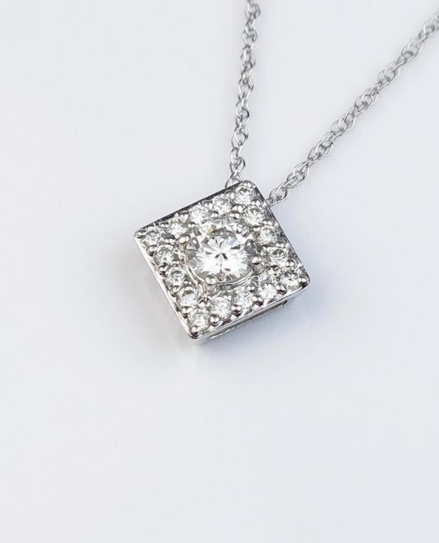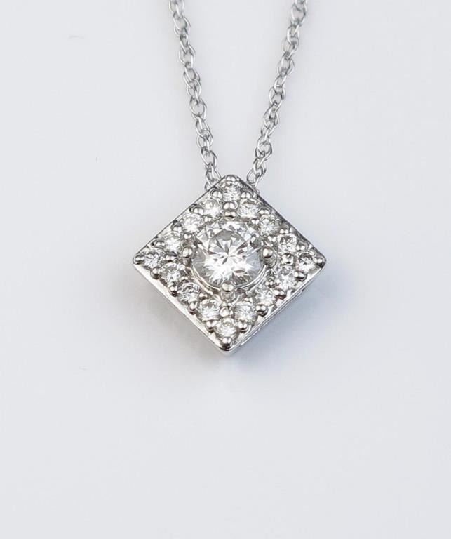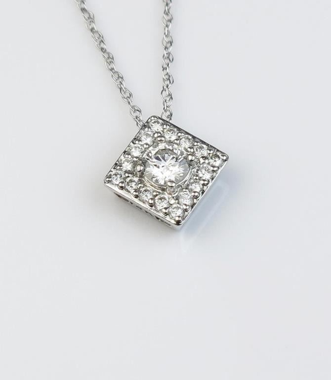 Vintage design Pendant with 17 ‘IDEAL’ cut Diamonds weighing approx. 0.60 carats total with F-G colors and VS clarity set in 14 karat white gold. Estimate $1,200-$1,800