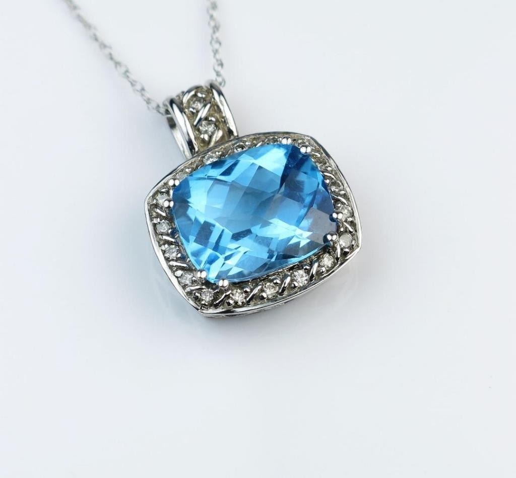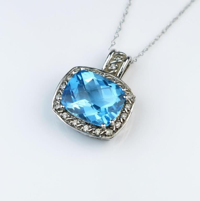 Vivid Blue Topaz and Diamond Pendant featuring a checkerboard cut Blue Topaz framed with 21 round cut Diamonds weighing approx. 0.30 carats with G-H colors and SI clarity set in stylish 14 karat white gold.Estimates $700-900