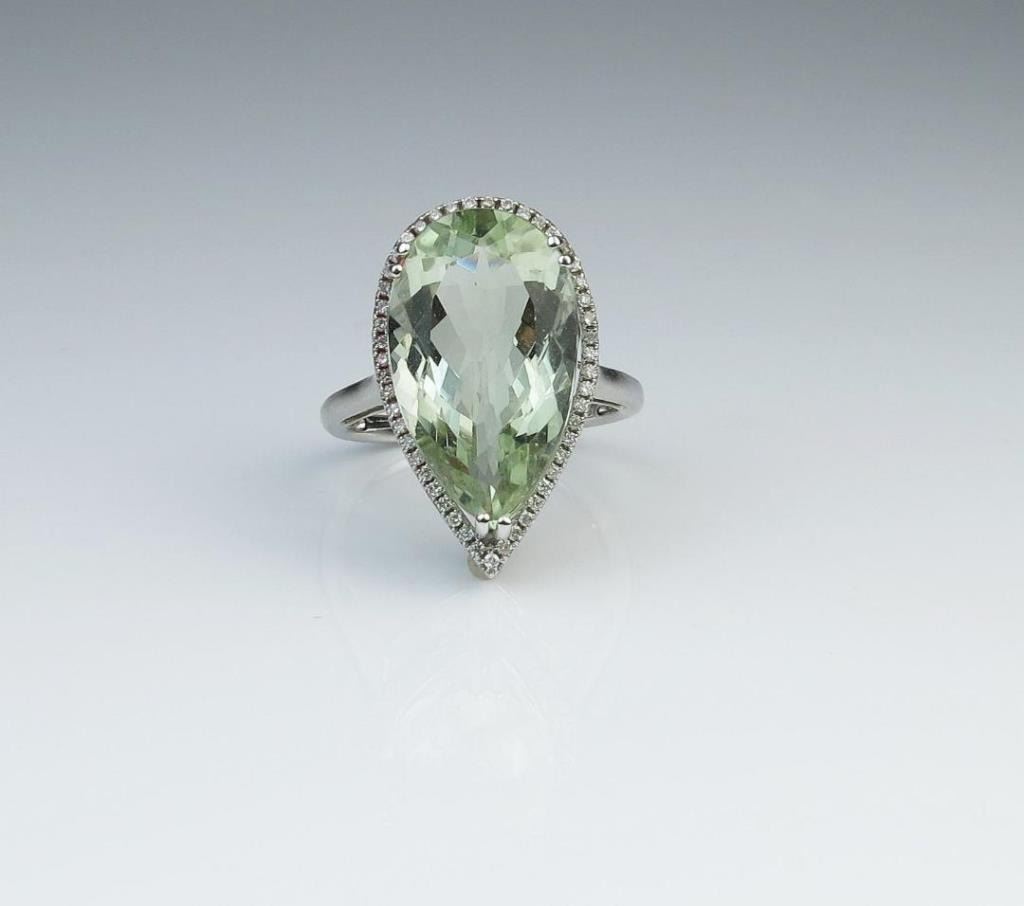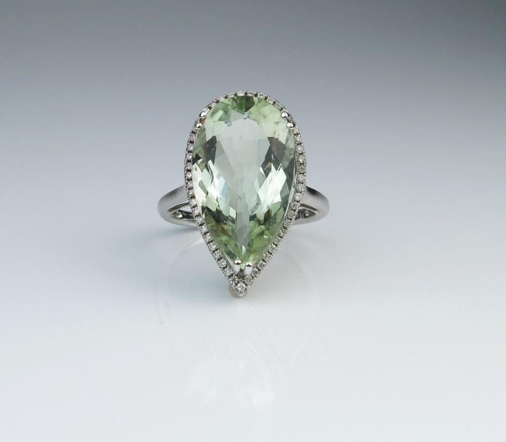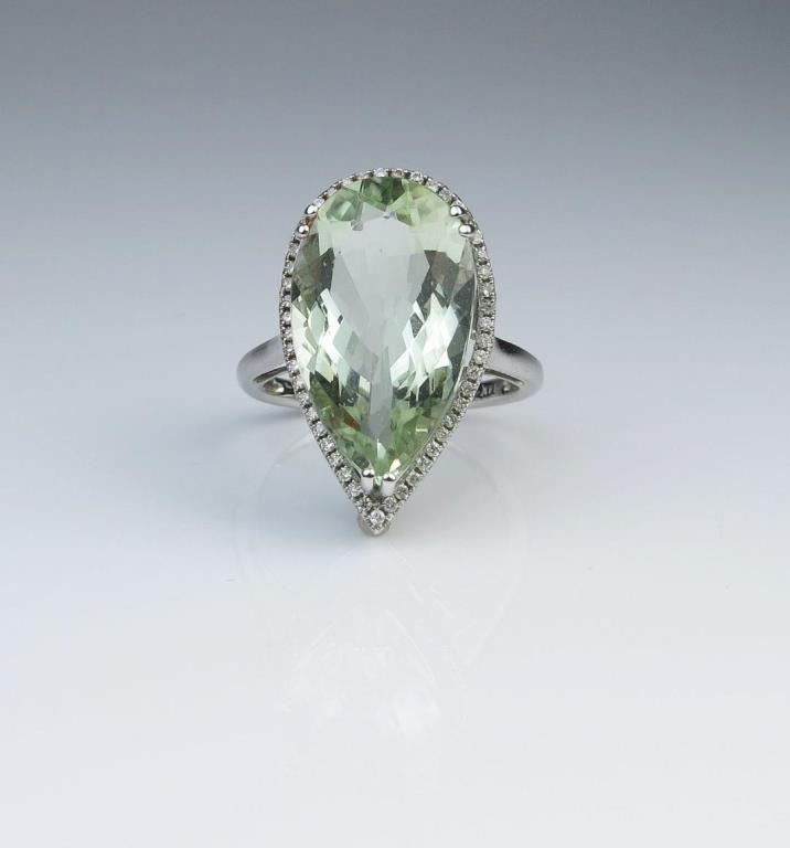 Amazing Green Amethyst and Diamond Ring featuring an approx. 10.00 carat pear shaped Amethyst framed with over 50 round cut Diamonds weighing approx. 0.50 carats with G-H colors and VS/SI clarity set in 14 karatwhite gold. Retail $2,000-$2,500 Estimates $1,000-$1,800