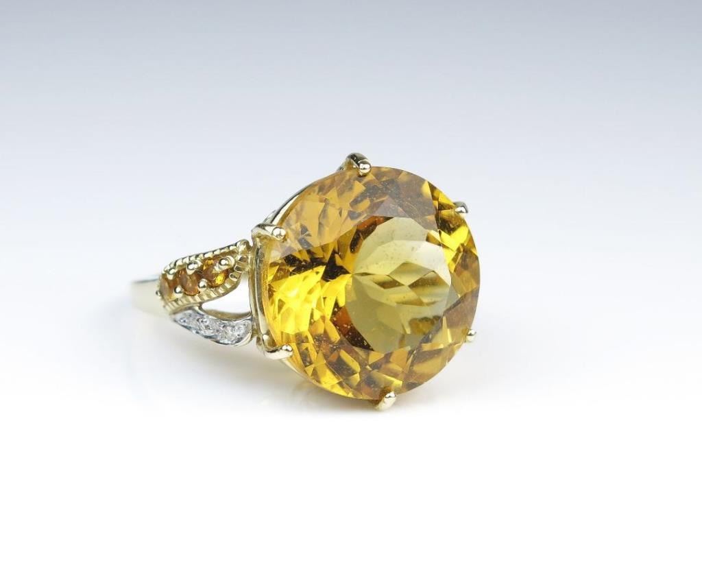 Fantastic Citrine and Diamond Cocktail Ring with large round cut Citrine weighing approx. 20.00 carats accented with Diamonds and smaller Citrines set in beautiful 10 karat yellow gold setting. Estimates $1,200-$1,800