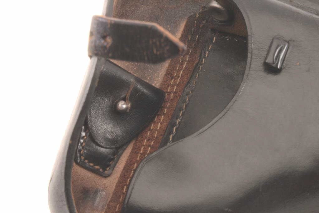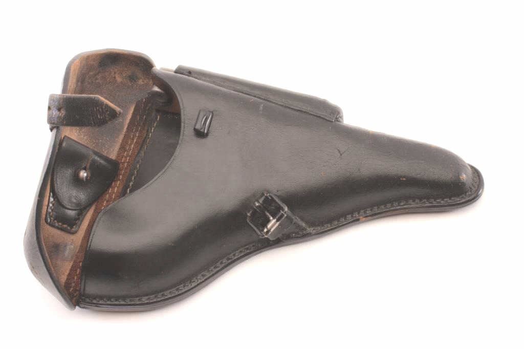 Luger holster with Eagle 101 proof including original magazine and modern takedown tool. Some black dye and polish added. Very good overall. About WWII era. Est.: $300-$600