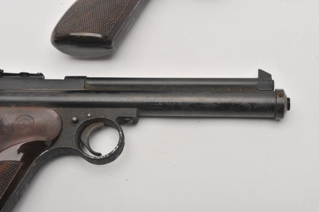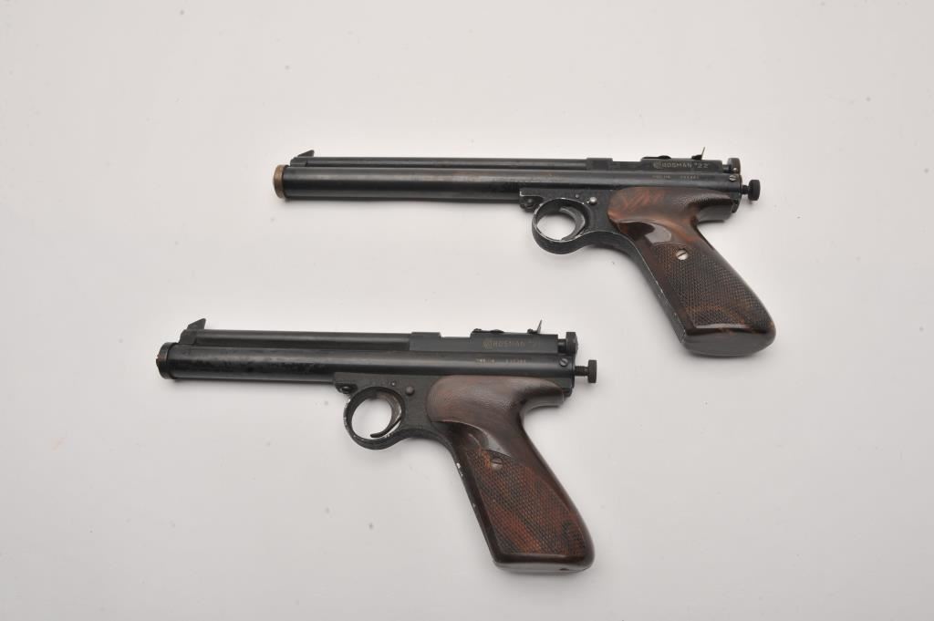 Lot of two Crosman CO2 air pistols. The first is a Crosman Model 112 .22 caliber pistol, Serial #251327 with an 8” barrel with the majority of the black finish still present. The checkered plastic grips are in good condition. The 2nd pistol is a Crosman Model 116 .22 caliber pistol, Serial #207093 with a 6” barrel with the majority of its black finish present. The checkered plastic grips are in good condition. Est.: $100-$200.