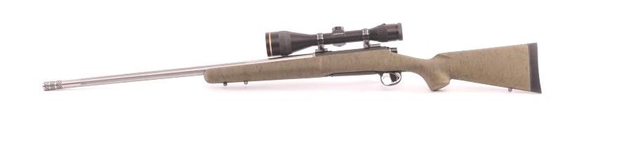 Custom Remington Model 700 bolt action rifle, approximately .33 caliber, Serial #E6262498. The rifle is in fine overall condition with a 27” fluted stainless steel compensated bull barrel. The barrel is not calibermarked but measures approximately .33 caliber. The receiver retains nearly all of its blue finish with an oversize target bolt handle added and hinged magazine floor plate. The H-S Precision synthetic stock is invery good condition with a solid rubber butt pad providing a 14” LOP. The bore is very good, the action is crisp and the markings are sharp. The rifle is topped with quick detach rings and bases and a Leupold LPS 3.5x 14 x 52 variable power rifle scope with an adjustable objective with clear, crisp optics. This is a well-constructed custom rifle by Gruning Precision that combines desirable target and sporter features,including a scope that lists for $2,000 by itself. Est.: $1,750-$3,500. (Modern).