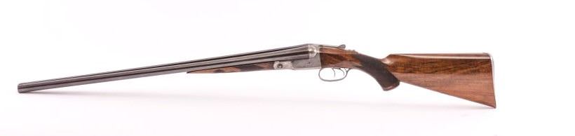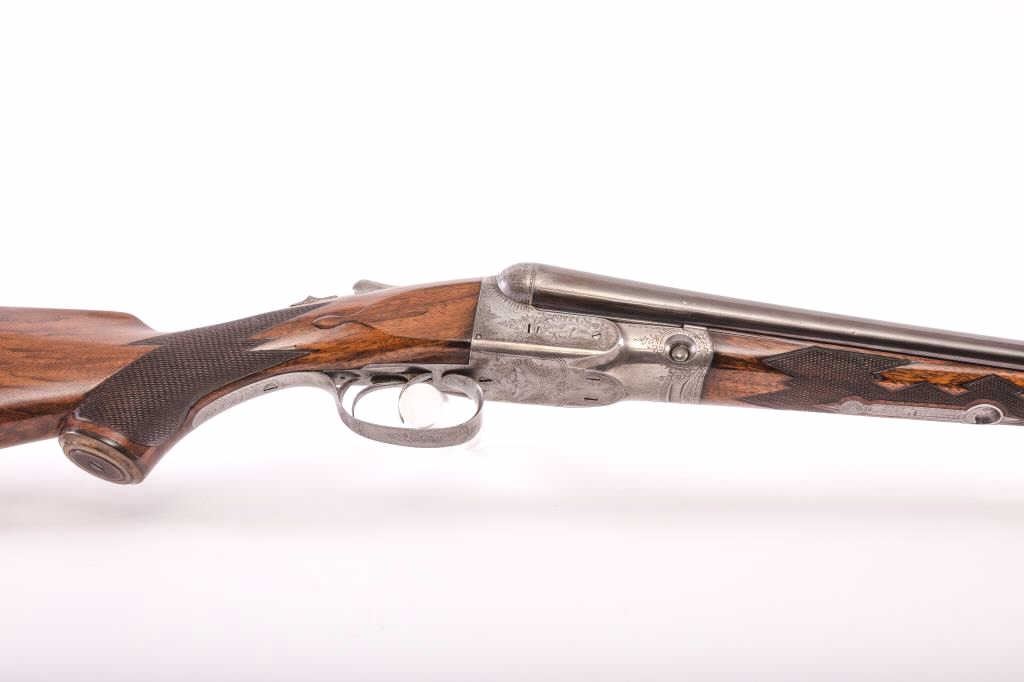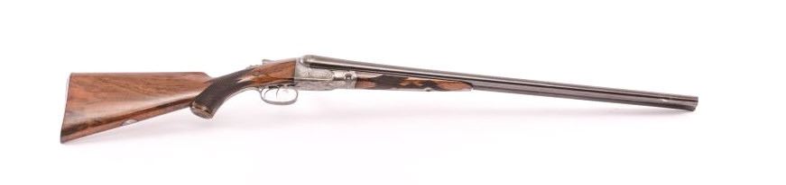 Parker D Grade side by side shotgun, 16 gauge, Serial #57484. The shotgun is in very good overall condition with 26 ½” barrels with a full-length filed rib. The shotgun has been re-barreled with V Gradereplacements, Serial #95326. The barrels retain the majority of their thinning blue finish with mars and scrapes from carry and use. The receiver shows silver toned case hardening with engraved game scenes on bothsides of the action and on the underside. The extractor action is tight on face. The finely checkered wood stocks are in very good condition with a blank silver escutcheon plate in the butt stock. The butt stock ends with a skeleton butt plate providing a 14 ½” LOP to the front trigger. The bores are good, the action is crisp and markings are sharp. Est.: $900-$1,800. (C+R).