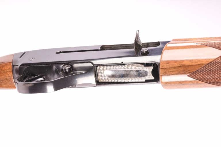 Winchester Super-X Model 1 semi-automatic shotgun, 12 gauge, Serial #M69749. The shotgun is in fine overall condition with a 28” barrel with a full-length ventilated rib and steel bead front sight. The barrel ismarked for 2 ¾” shells with a modified choke. The metal surfaces retain nearly all of their blue finish with light handling marks. The checkered wood stock is in very good condition with only light storage marksnoted. The buttstock ends with a plastic Winchester marked butt plate providing a 14 ½” LOP. The bore is good, the action is crisp and the markings are sharp. Est.: $350-$700. (Modern).