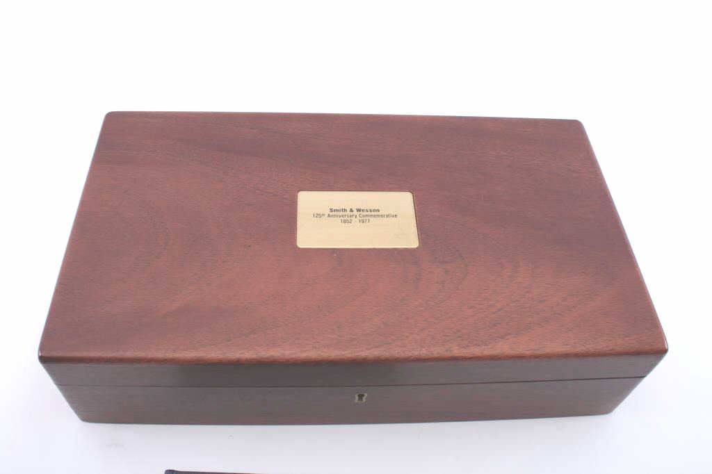 Commemorative 125th Anniversary Smith and Wesson Model 25-3 revolver, .45 caliber, Serial #7933. The pistol is as new in the factory box with a 6 ½” barrel with a red ramp front and adjustable rear sights. Thepistol retains nearly all of its blue finish with the S&W logo and 125th Anniversary on the frame and barrel in gold script. The hammer and trigger display vivid case hardening. The smooth wood gold medalliongrips are in excellent condition. The pistol is packed in the original blue cardboard factory box with a beautiful hardwood display case lined in blue velvet. The lot further includes a copy of Roy Jinks book, “125 Years with Smith & Wesson”. The pistol is as new, showing little if any use. Est.: $900-$1,800. (Modern/PPT).
