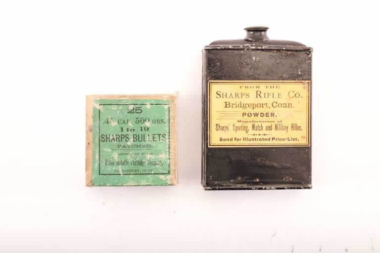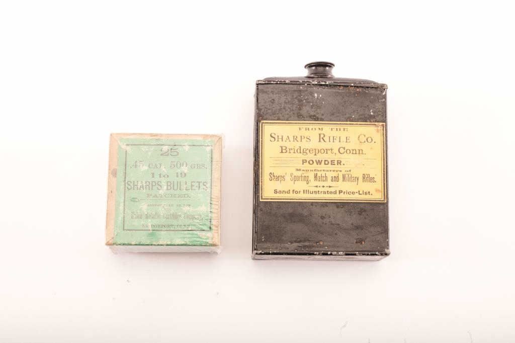 Lot of 2 Sharps rifle collectibles including a small black powder can with yellow label “From the Sharps Rifle Co./Bridgeport, Conn./Powder/Manufacturers of/Sharps’ Sporting, Match and Military Rifles/Send forIllustrated Price-List and a green label box of 25 Sharps Patched Bullets in .45 caliber 500 grs by Union Metallic Cartridge Company; both items in overall good condition. Est.: $200-$400.