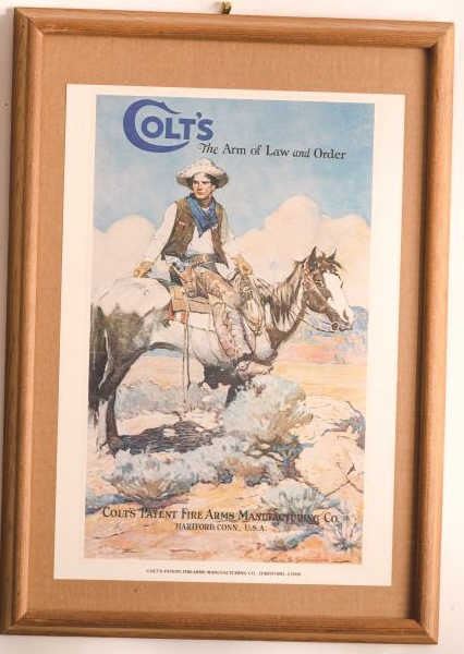 Later edition of famous “Tex and Patches” Colt Firearms Manufacturing Co. color poster; approximately 21” x 15” overall including wood frame (no glass); very good condition and a great decorator for the gun room orlibrary. Est.: $100-$200.