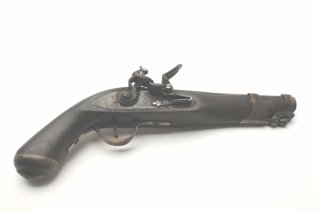 Replica of a flintlock pistol, .58 caliber, 8” barrel, wood stock; overall good with working action. (Flintlock). Est.: $100-$200.
