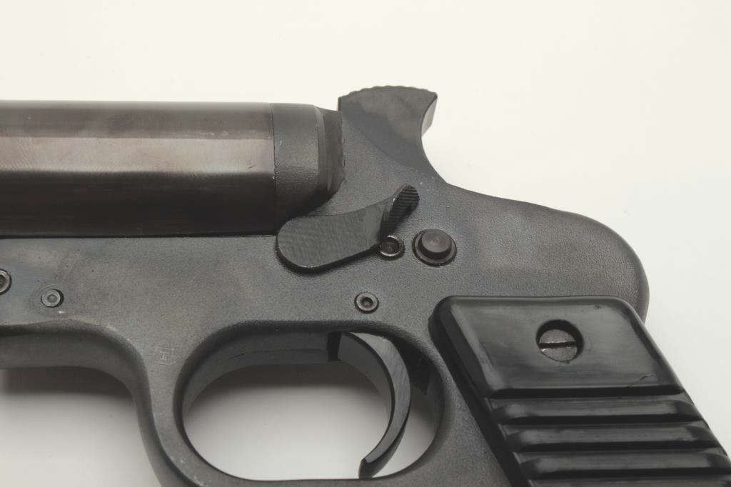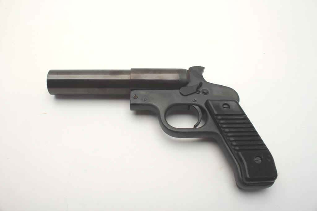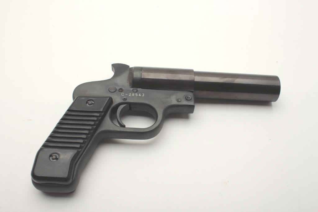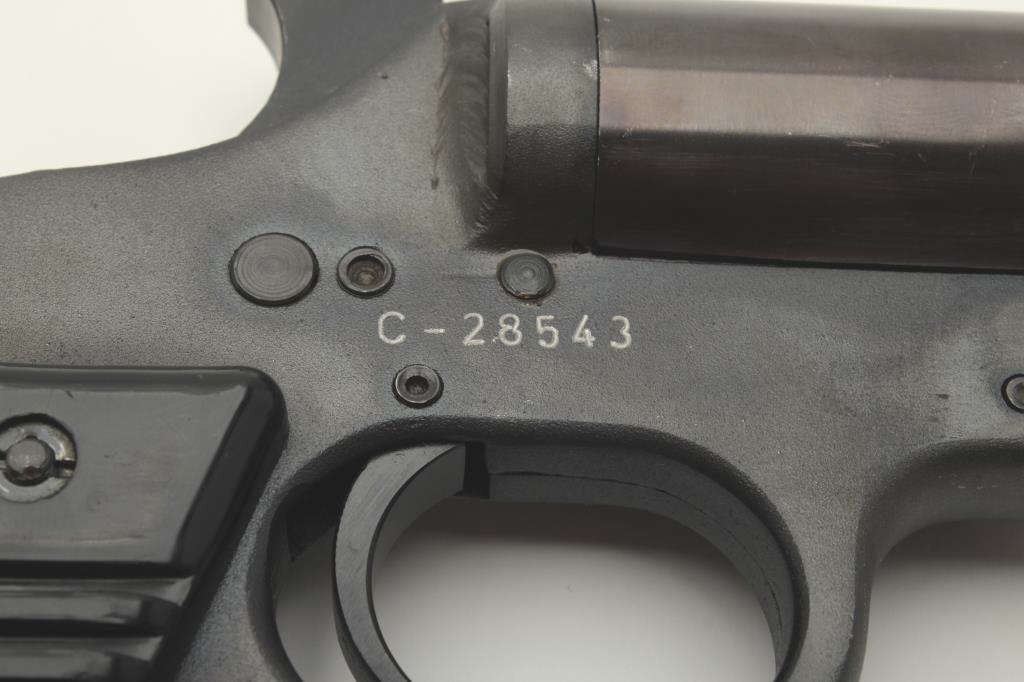 Yugoslavian Model 57 Flare gun with crest on top of barrel, approximately 26.5mm caliber, 6” barrel, blued finish, hard rubber grips, S/N C-28543; overall fine condition showing little if any use. Est.: $150-$300.