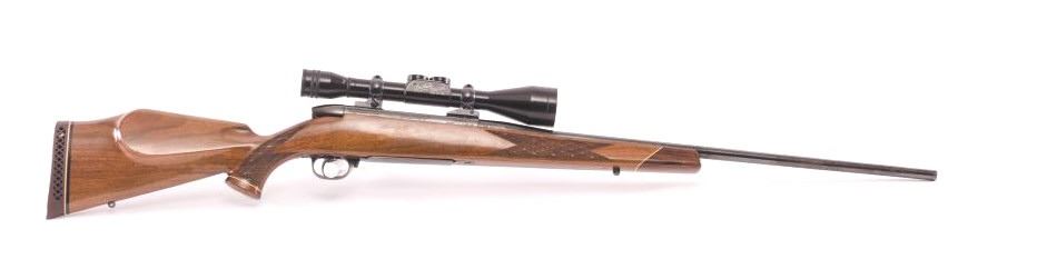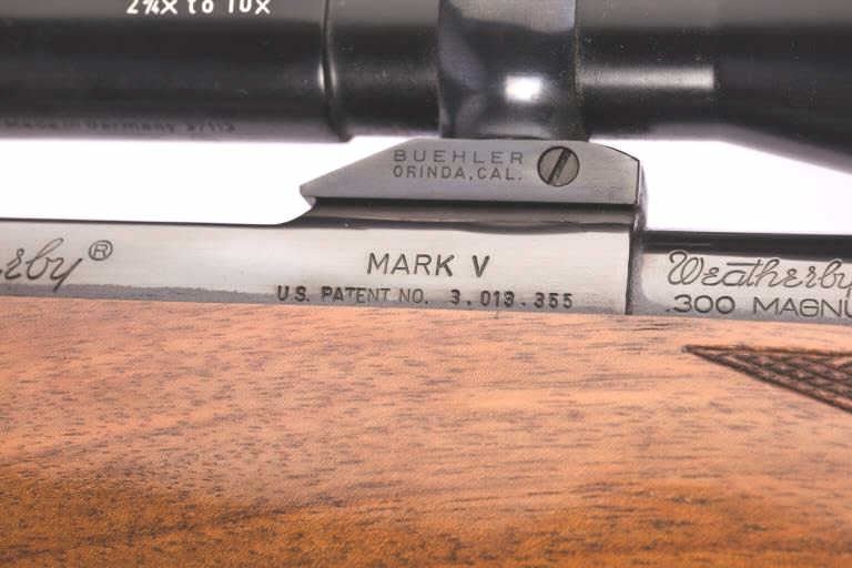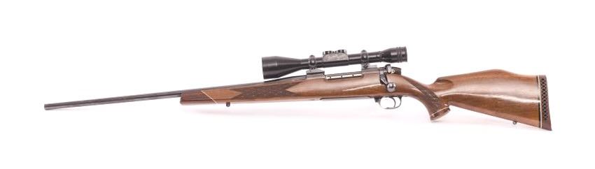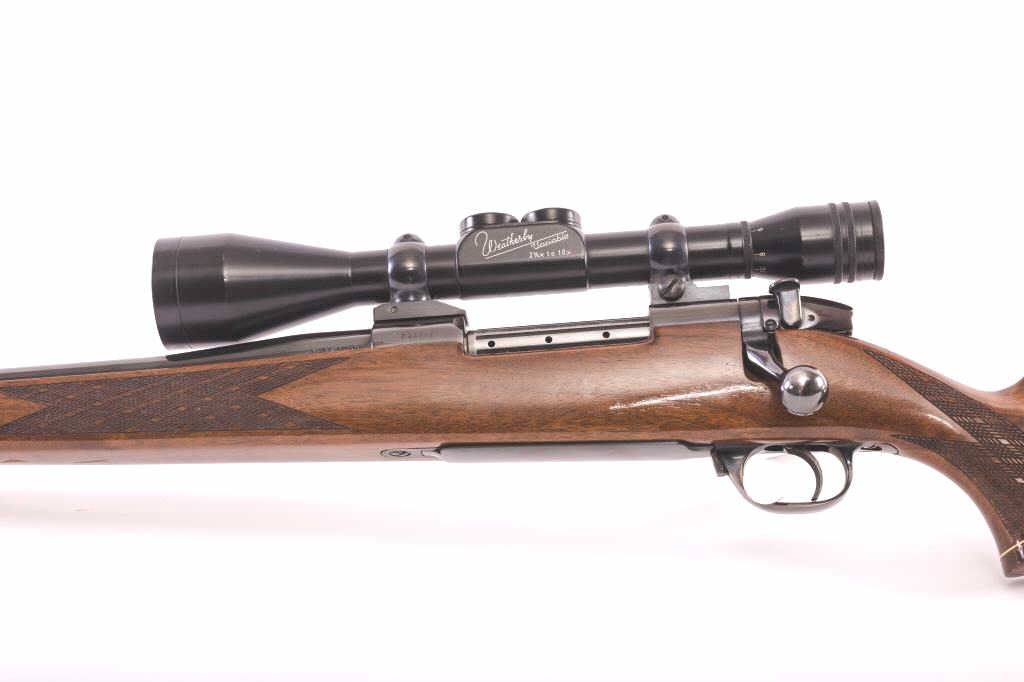 Left handed Weatherby Mark V bolt action rifle, .300 Magnum caliber, Serial #P23737. The rifle is in fine overall condition with a 24” barrel. The metal surfaces retain the majority of their blue finish with areas ofthinning finish on the barrel and at the muzzle. The barrel is marked, “MADE IN W. GERMANY”. The finely checkered Walnut stock features Rosewood fore end cap and pistol grip. The butt stock ends with a ventilatedrubber recoil pad providing a 14” LOP. The bore is good, the action is crisp and the markings are sharp on this German Weatherby. The rifle is topped with Buehler mounts and rings with a Weatherby Variable 2 ¾ x 10power rifle scope with clear, crisp optics. Est.: $900-$1,800. (Modern).
