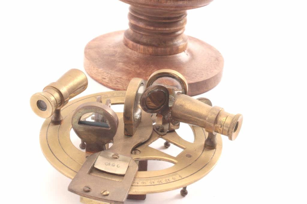 Unmarked brass octant with wooden base. The sextant is in very good condition with a decorative 4” tall hardwood base. A nice decorator piece for the sailor. Est.: $75-$125.