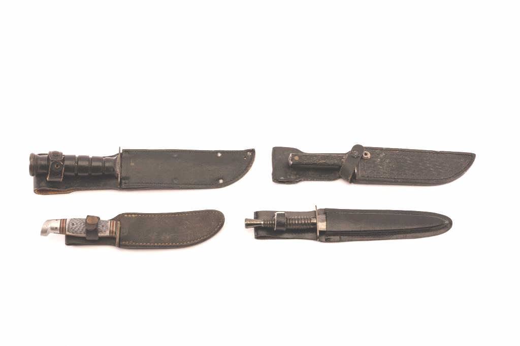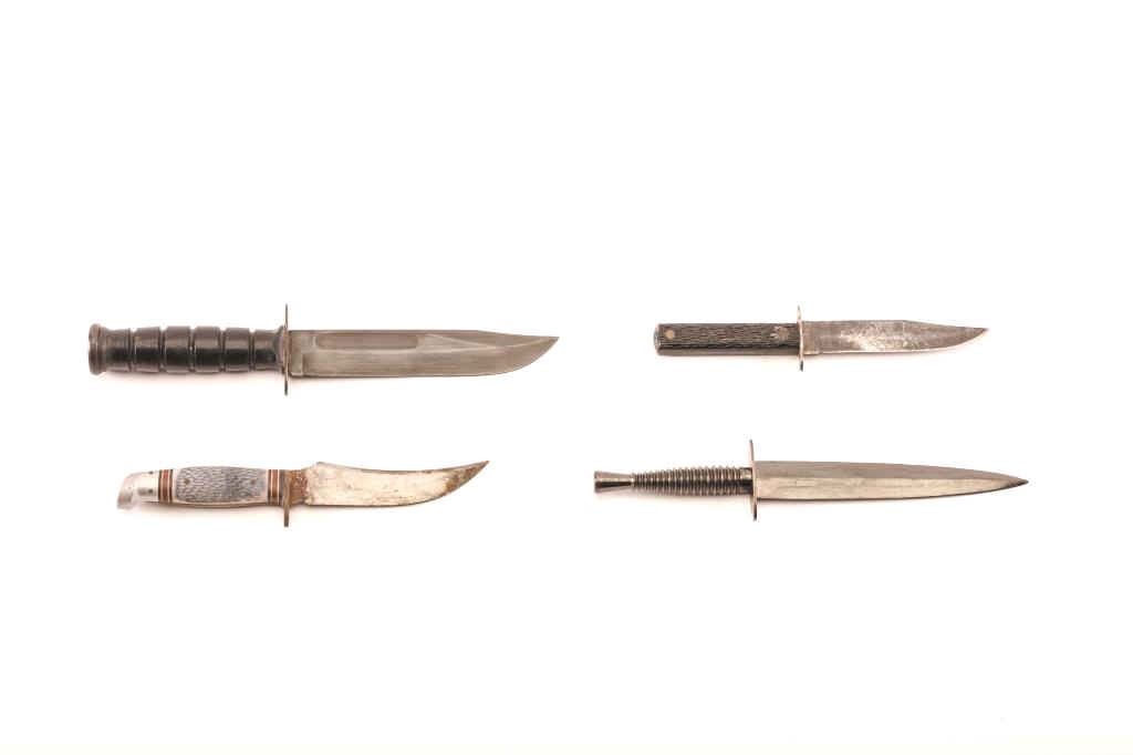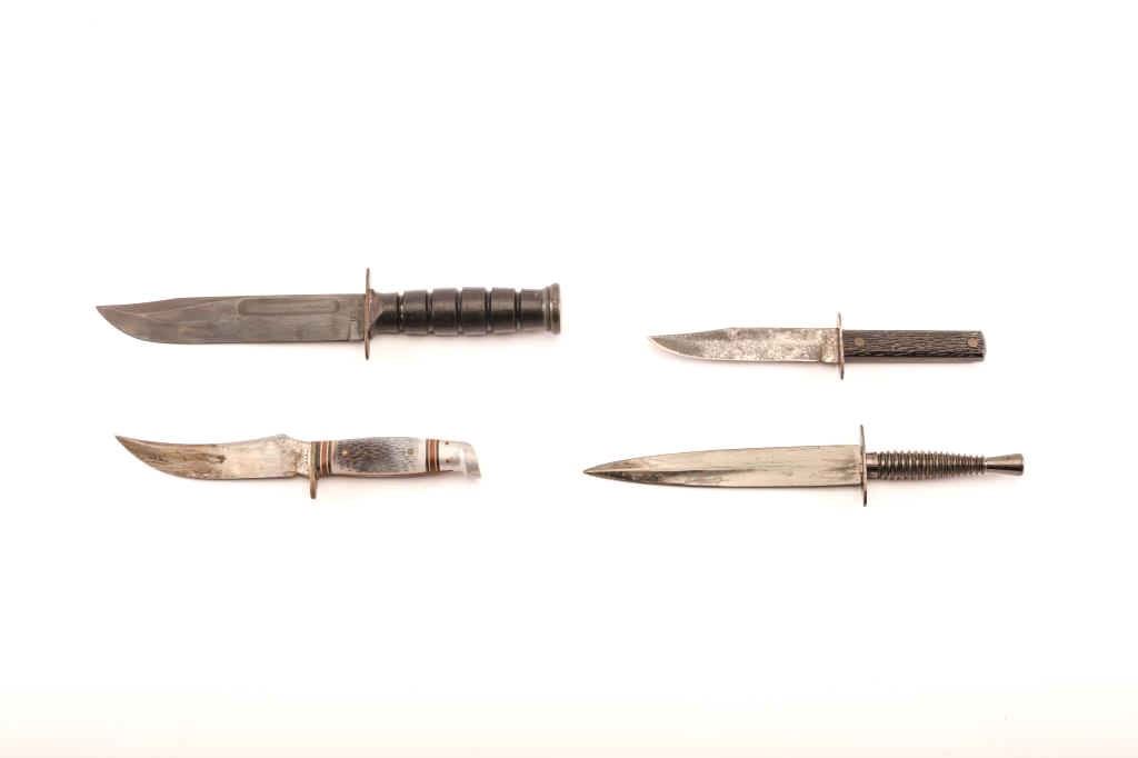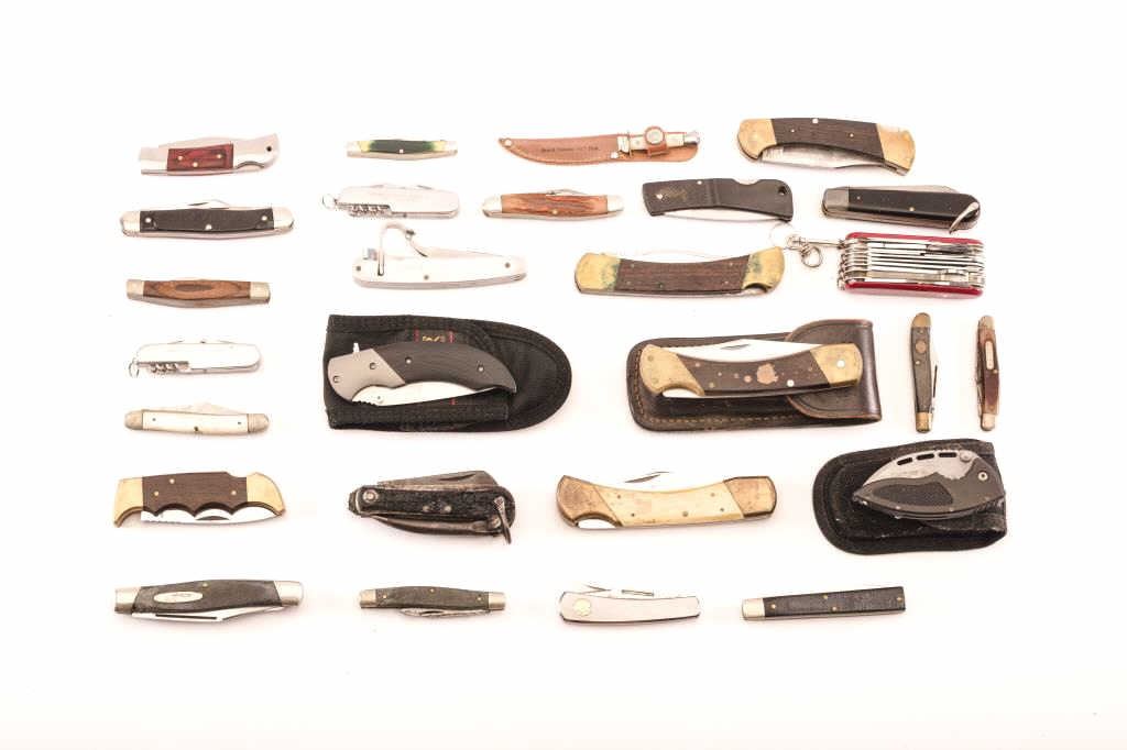 Bonanza lot of knives including over 25 folding and three fixed blade knives. The lot includes folders by Ka-Bar, Kershaw, Buck, Gerber, Schrade, Camillus, Browning, Remington, Parker-IAMI and Swiss Army amongothers. Additionally, the lot includes a period, H. Rowbotham CC 1029 British Army knife in rough condition, circa 1950. A bonanza lot for the knife collector or gun show seller. Est.: $175-$350.
