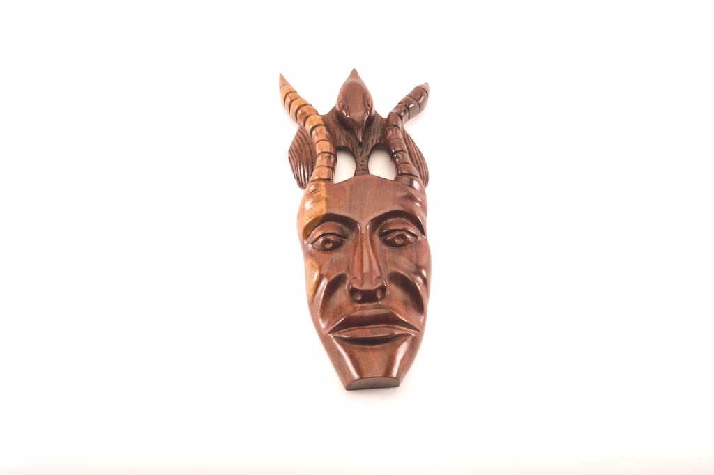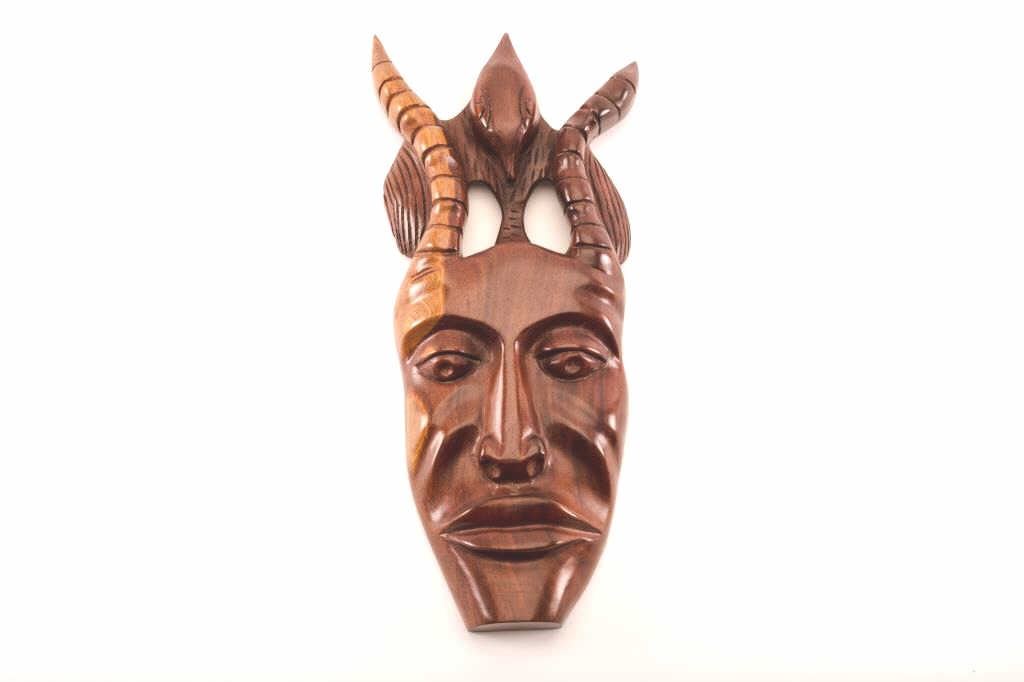 Indonesian carved hard wood wall hanging depicting a man with goat’s horns. The piece is approximately 18” tall by 7” wide and beautifully hand carved in Indonesian hard wood. The color and figure to the wood isimpressive. Est.: $75-$150.