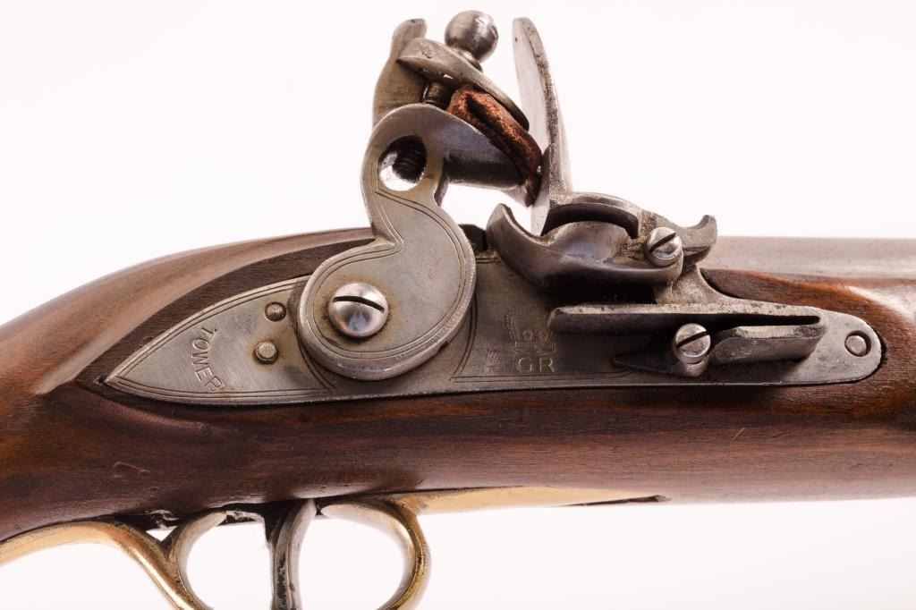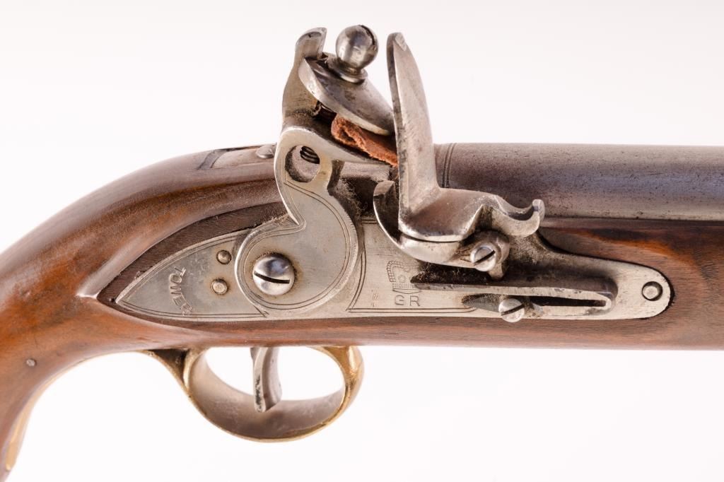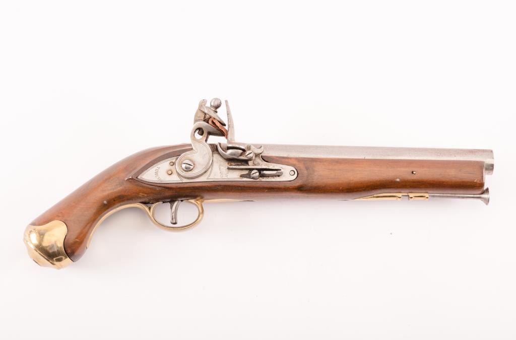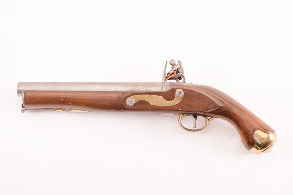 Hawes reproduction flintlock Tower pistol, .69 caliber, Serial #NSNV. The pistol is in very good overall condition with a 9” barrel. The metal surfaces are finished in the white with light surface rust on the barrel. The side plate is marked, “TOWER”. The smooth wood stock is in good condition with a brass trigger guard and butt. Est.: $125-$250.