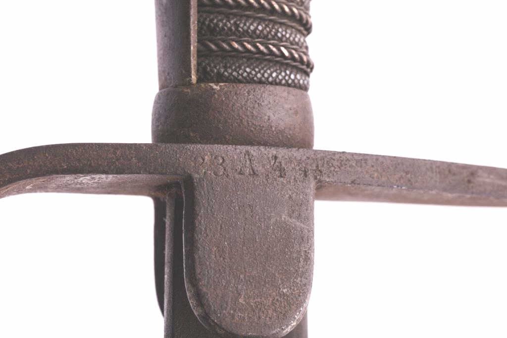 Unmarked European sabre without scabbard. The sabre is 38” in total length with a 34” blade. The blade has gone to an overall brown patina with light surface erosion in areas. It does not appear to have beensharpened. The simple iron handguard has also taken on a brown patina and protects a wire wrapped ray skin grip in good condition. Est.: $150-$300.