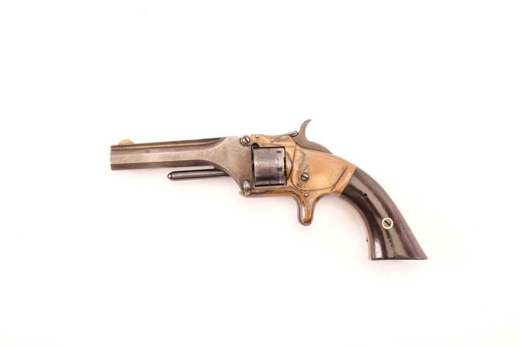 Smith & Wesson Model No. 1, 2nd issue spur trigger revolver, .22 caliber, 3.25” barrel, blued finish, brass frame, rosewood grips, back strap inscribed “C. H. D. Jr./July 15, 1876”, S/N 117323; brown patina on barrel,traces of blued finish on cylinder, taffy color patina on brass frame, good markings and grips, hammer advances cylinder but does not remain on full cock; typewritten note indicates this gun belonged to Dr.Dalrymple’s uncle, Charles Hoagland Dalrymple, Jr. and was given to Dr. Dalrymple by his father when he graduated from high school in 1935. The gun was then gifted by Dr. Dalrymple in 1978 to our consignor. (Antique). Est.: $150-$300.