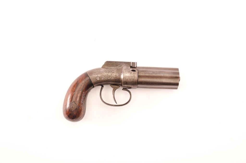 Union Arms Co.-marked 6-shot pepperbox derringer, .31 caliber, 2.5” barrel, brown patina, wood grips, S/N I2 stamped on left side of trigger; overall good condition with good engraving on recoil shield, good action, good markings and good wood grips; typewritten note indicates consignor received from his father-in-law, Dr. Dalrymple, this gun in 1978. (Antique). Est.: $250-$500.