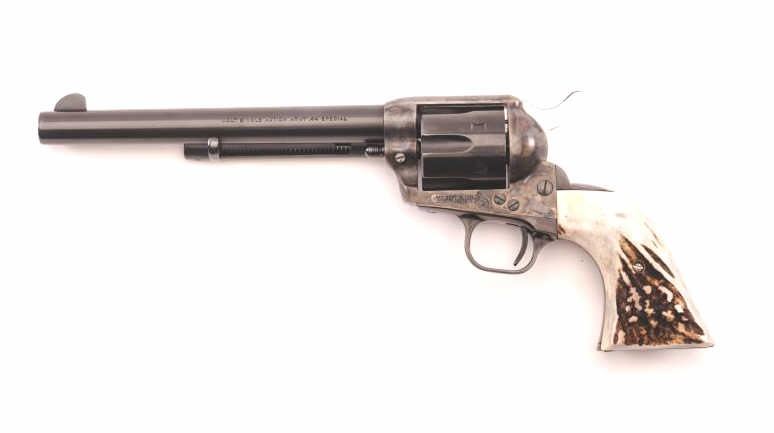 Colt Third Generation SAA revolver, .44 Special caliber, 7.5” barrel, blued and case hardened finish, thick stag grips, S/N SA61794; overall near new condition showing little handling. Beautiful stag grips,bright case colors on frame. (Modern/PPT). Est.: $800-$1,600.