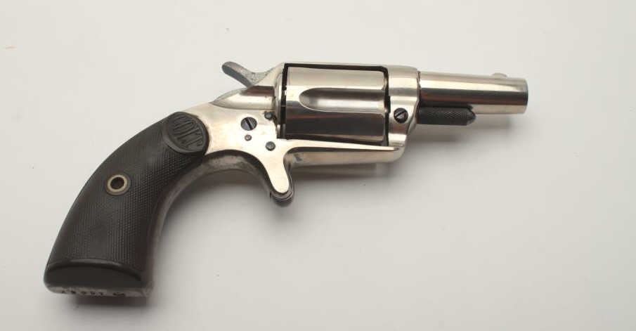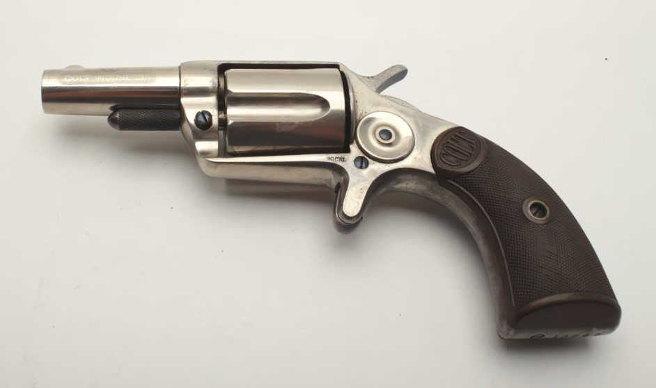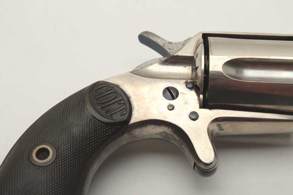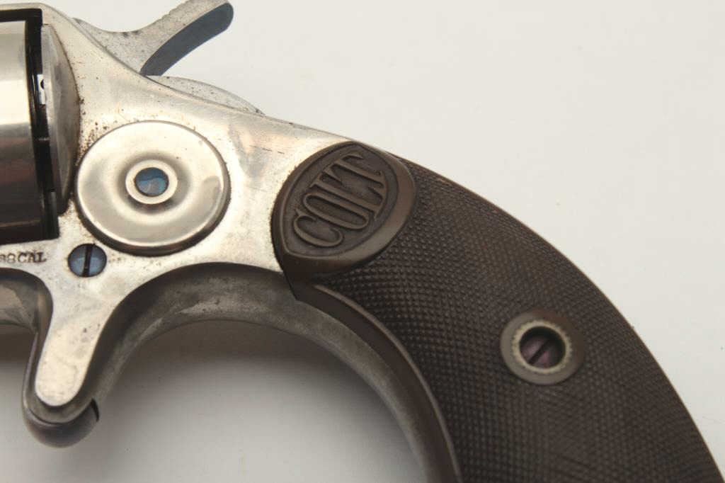Colt House pistol, .38 caliber, 2.25” etched panel barrel, nickel finish, checkered hard rubber grips, S/N 16657; overall very good to near fine condition showing majority of original nickel finish, complete etched panel on left side of barrel, screw heads show majority of niter blue finish, crips action, sharp markings, very good grips. Accompanied by typewritten note indicating gun purchased from Cardwell Curren in Sept., 1958.(Antique). Est.: $400-$800.