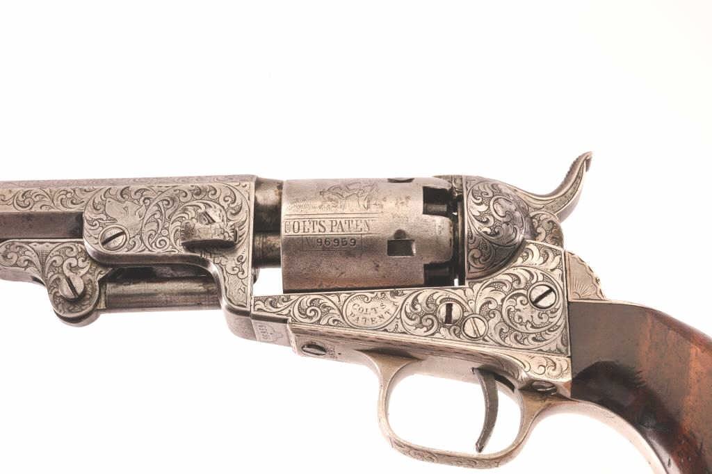 Important Gustave Young engraved Colt Model 1849 Pocket percussion revolver, .31 caliber, 5” barrel, grey patina, wood grips, S/N 96959; overall good to very good condition showing an old light cleaning to metalsurfaces that have returned to an even grey patina, majority of cylinder scene remains, crisp action, very good markings including two dog head panel scenes, one on each side of the barrel, an eagle head panel scene onthe right rear frame side and wolf’s head on the hammer front; very good burl walnut grips. Accompanied by several pages of typewritten notes and correspondence on this gun including a copy of a page from Wilson’s“Book of Colt Engraving” that shows a listing of Gustave Young engraved pistols including this gun by highlighted serial number. Consignor notes this beautiful engraved Colt came from his father-in-laws collection (Dr.Robert Darlymple) who bought it from Theodore Dexter in Dec., 1962. Further research by our consignor discovered its listing in the Wilson book. (Antique). Est.: $2,500-$5,000.