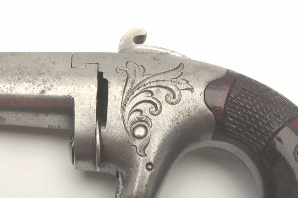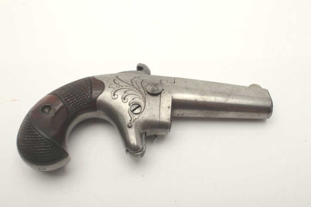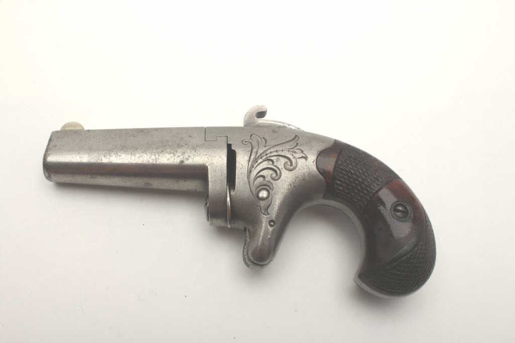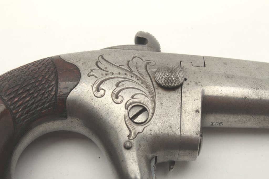 Colt No. 2 Derringer, engraved iron frame, checkered wood grips, .41 caliber, 2.25” barrel, grey patina, S/N 981; overall good to very good condition with an even grey patina to metal surfaces, crisp action, sharpmarkings and very good grips; consignor notes gun was purchased in 1963 from Jackson Arms in Dallas, TX, by his father-in-law, Dr. Robert Dalrymple. (Antique). Est.: $600-$1,200.