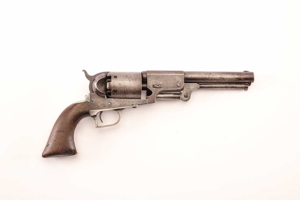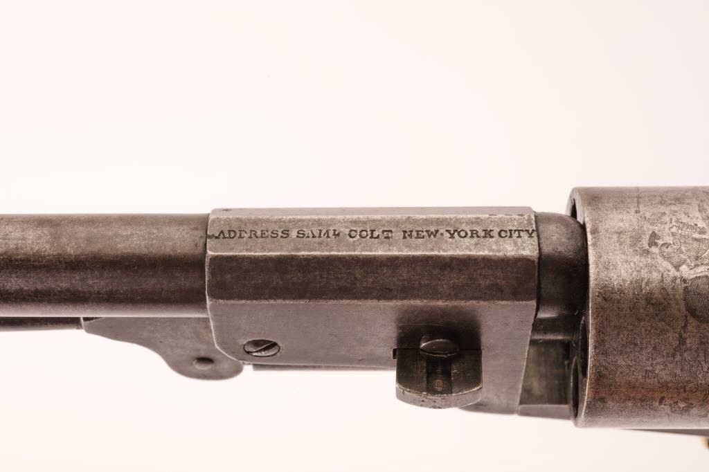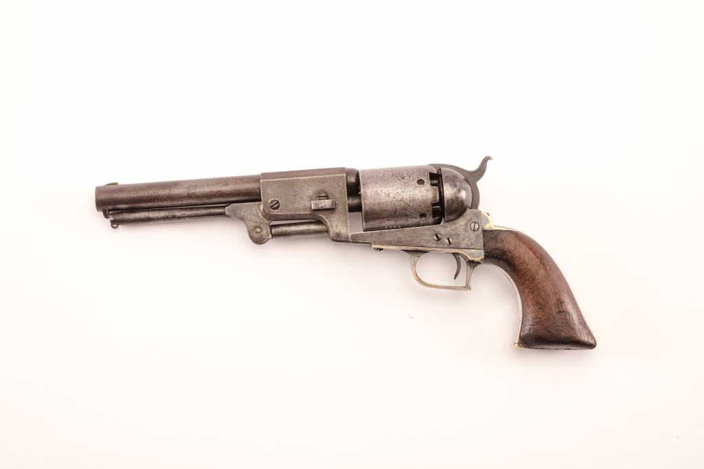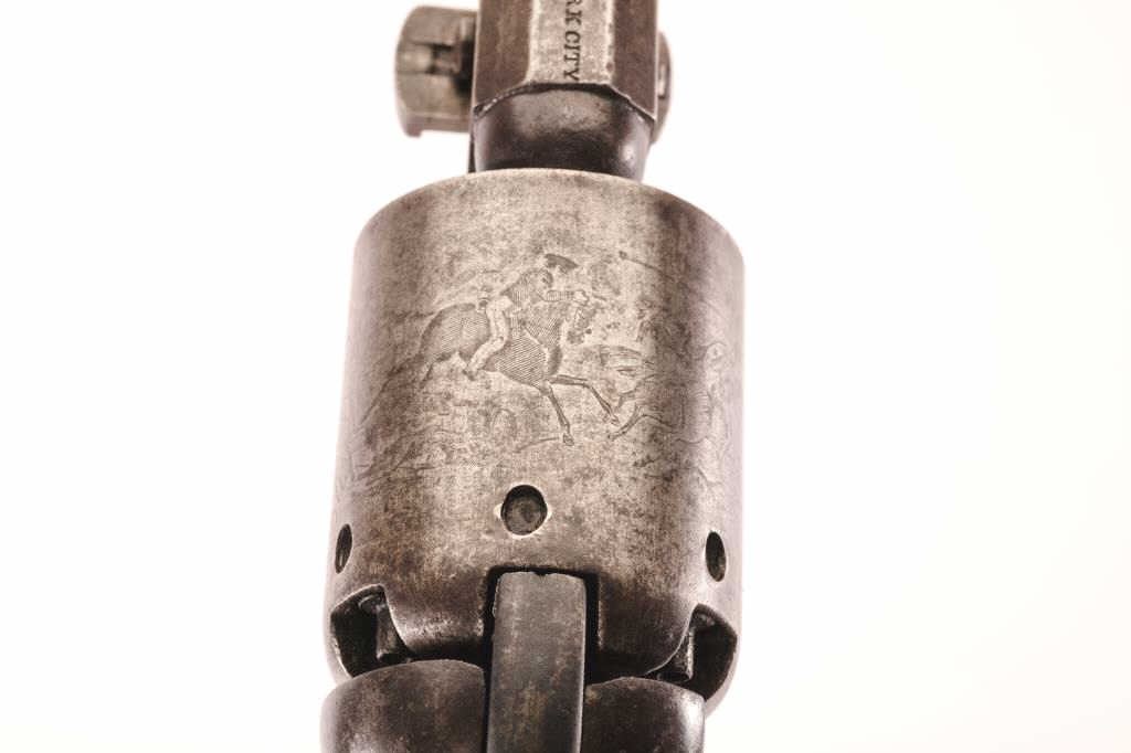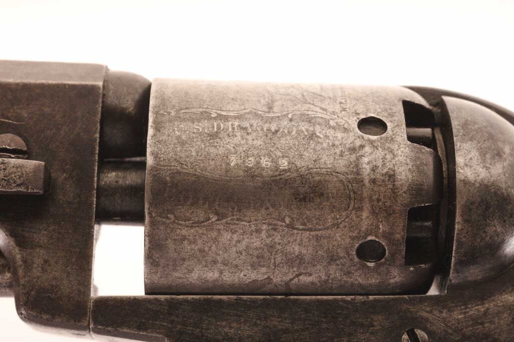 Desirable Colt First Model Dragoon percussion revolver with scarce “U.S. Dragoons” cylinder scene, .44 caliber, 7.5” barrel, even dark patina to metal surfaces, considerable areas of silver wash to trigger guard and back strap, wood grips, S/N 7962 (all matching except barrel wedge which is un-numbered); overall good to very good condition with majority of cylinder scene remaining, crisp action, sharp markings, grips are good with wear from carry, some minor old mars which is to be expected and a small old loss to the bottom front toe of the left side of the grip. Accompanying this First Model Dragoon is a typewritten letter covering information on it and noting it was previously in the Romaine Fielding Collection and purchased from legendary arms collector and dealer, Theodore Dexter, on October 4, 1963 by consignor’s father-in-law, Dr. Robert Dalrymple. It is our opinion that this is one of the finest First Model Dragoons seen in years given the hard use they saw during the California Gold Rush and Civil War periods. Set your sights up for this historic piece! (Antique). Est.: $10,000-$20,000.