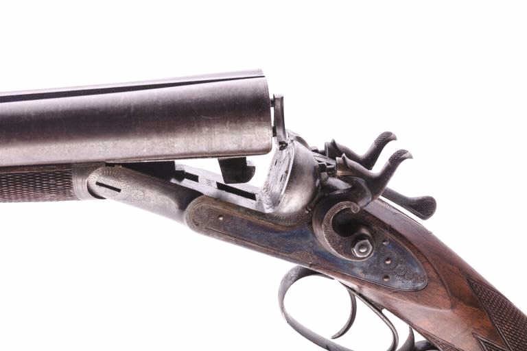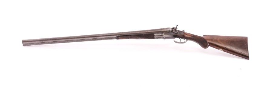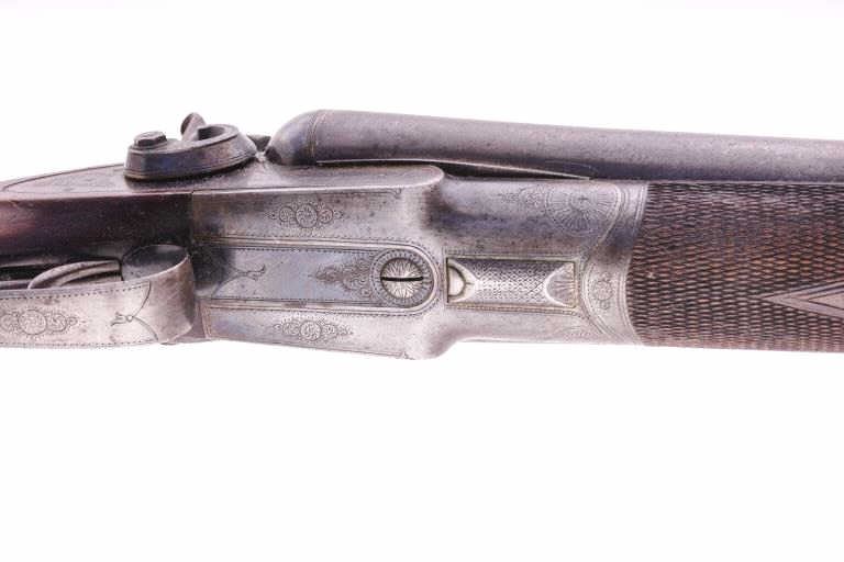 Colt Model 1878 Hammer Double Barrel Shotgun, 10 gauge, 31” damascus barrels, blued finish, checkered wood stocks, 9 pound weight, factory engraved, S/N 5180; overall very good to fine condition with near finebores, crisp actions, majority of damascene pattern on barrels with majority of original case colors on receiver, sharp markings and very good wood stocks; accompanied by a factory letter confirming all features andnoting shipment to Chut Allening (address unavailable) on Sept. 28, 1880, one gun in shipment. (Antique). Est.: $1,000-$2,000.