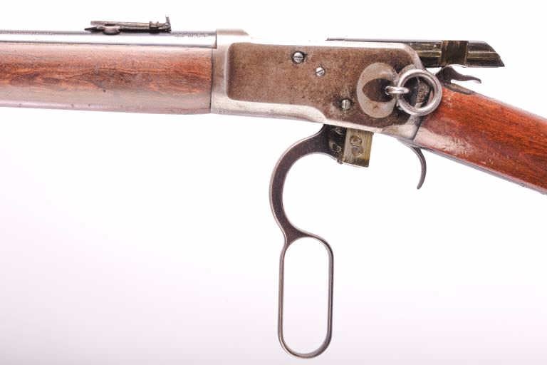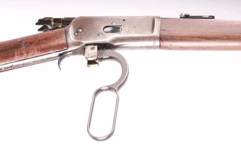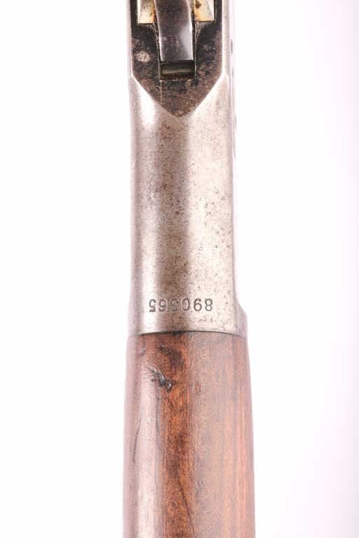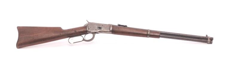 Winchester Model 92 lever action SRC, .44 W.C.F. caliber, 20” barrel, blued finish, wood stocks, S/N 890365; overall good to very good condition with majority of original blued finish remaining on barrel and loadingtube, grey/brown patina on receiver mixed with traces of original blued finish in protected areas, crisp action, sharp markings, good bore, and good wood stocks with butt stock showing scattered mars andscratches from carry and storage. (C&R). Est.: $1,750-$3,500.