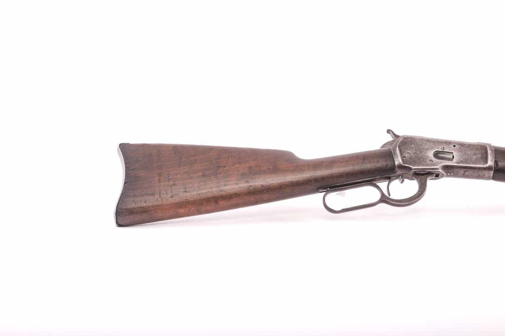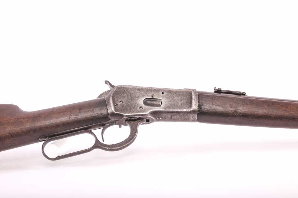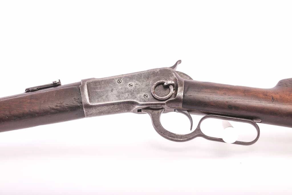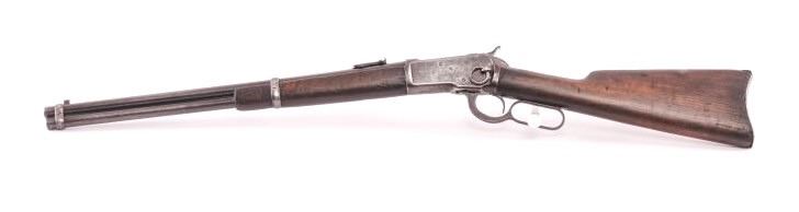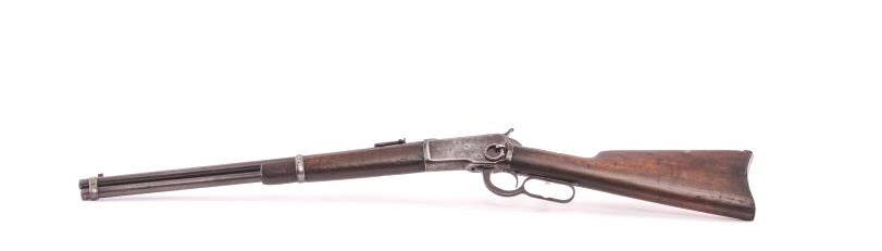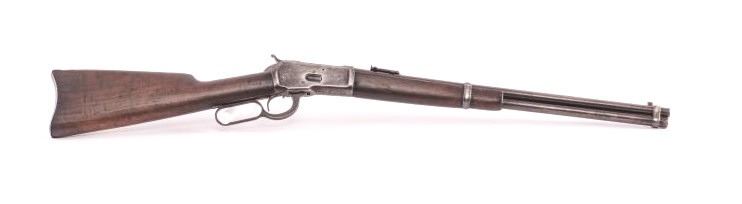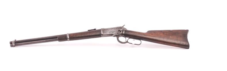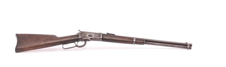 Winchester Model 1892 lever action SRC, .44 W.C.F. caliber, 20” barrel, brown patina, wood stocks, S/N 601818; overall good to very good condition with pleasing dark patina to metal surfaces, crisp action, good markings,fair bore, good wood stocks displaying scattered wear, mars and scratches from carry and storage. (C&R). Est.: $800-$1,600.