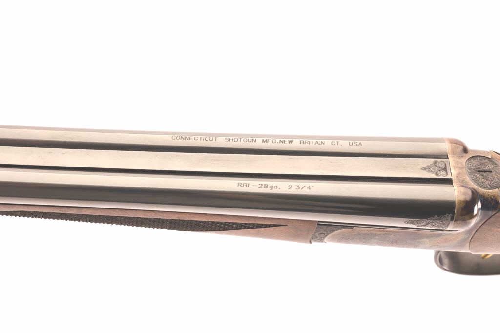 Connecticut Shotgun Company RBL side by side shotgun, 28 gauge, Serial #RBL003010. The shotgun is as new in the factory luggage case. The 26” barrels are choked Skeet and Improved Cylinder with a full-length solidgame rib and brass bead front sight. The receiver is game scene engraved with a pointer and setter with nearly full coverage scroll over beautiful case hardening. The shotgun features double gold triggers andautomatic ejectors. The finely checkered stock is stunning American Black Walnut with beautiful figure and a hand rubbed satin finish. The butt stock ends with a hard plastic butt plate providing a 14 ¼” LOP tothe front trigger. The lot includes a Connecticut Shotgun MFG. Co. luggage case lined in maroon baize with all accoutrements including silver plated snap caps, oiler, choke set and shooting glasses. A top of the line round body side by side shotgun with all the accessories that appears unfired. Est.: $1,400-$2,800. (Modern).