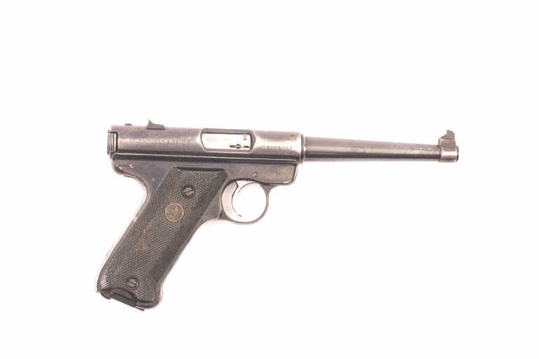 Ruger MKI semi-automatic pistol, .22 Long Rifle caliber, Serial #13-75760. The pistol is in good overall condition with a 6” barrel. The pistol retains the majority of its thinning blue finish with significantwear on the slide and barrel consistent with carry and use. The checkered plastic medallion grips are in good condition. The bore is good, the action functions and the markings are legible. The lot includes onecorrect magazine. Est.: $150-$300. (Modern/PPT).