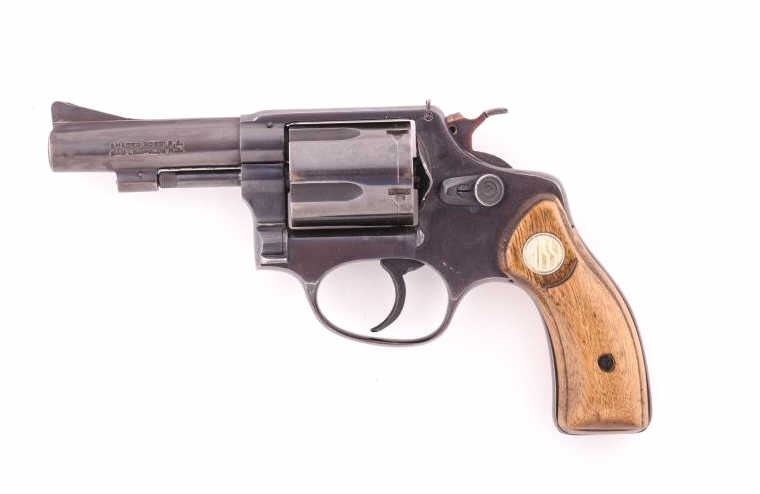 Rossi double action revolver, .38 Special caliber, Serial #D251978. The pistol is in good overall condition with a 3” barrel. The metal surfaces retain a significant amount of thinning blue finish with wear at themuzzle and a drag line on the cylinder. The hammer shows old, toning case colors. The smooth wood medallion grips are in good condition with small mars from carry and use. The bore is fair, the action functions andthe markings are legible. Est.: $150-$300. (Modern/PPT).