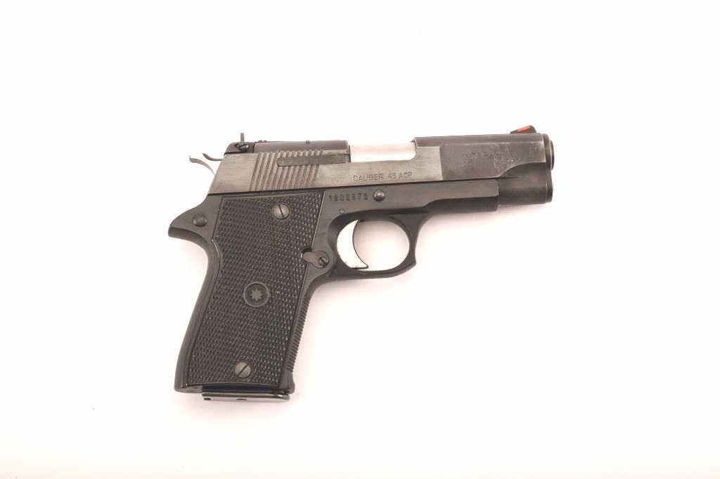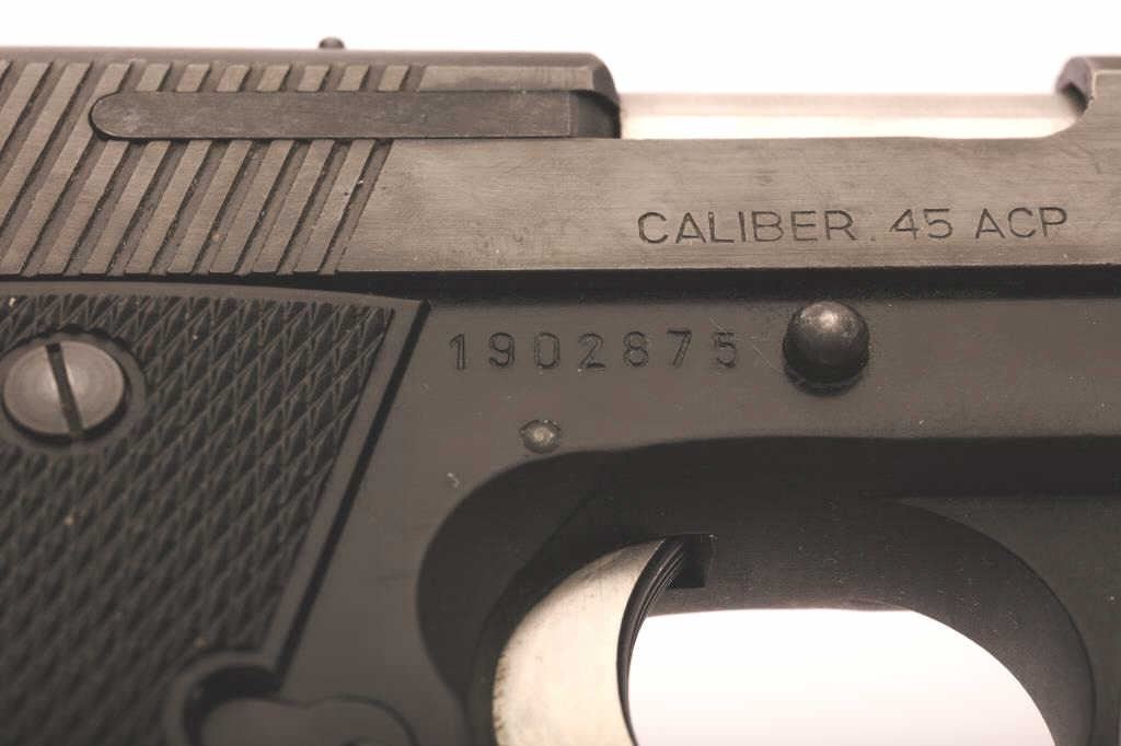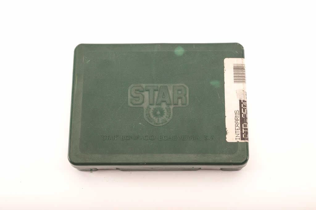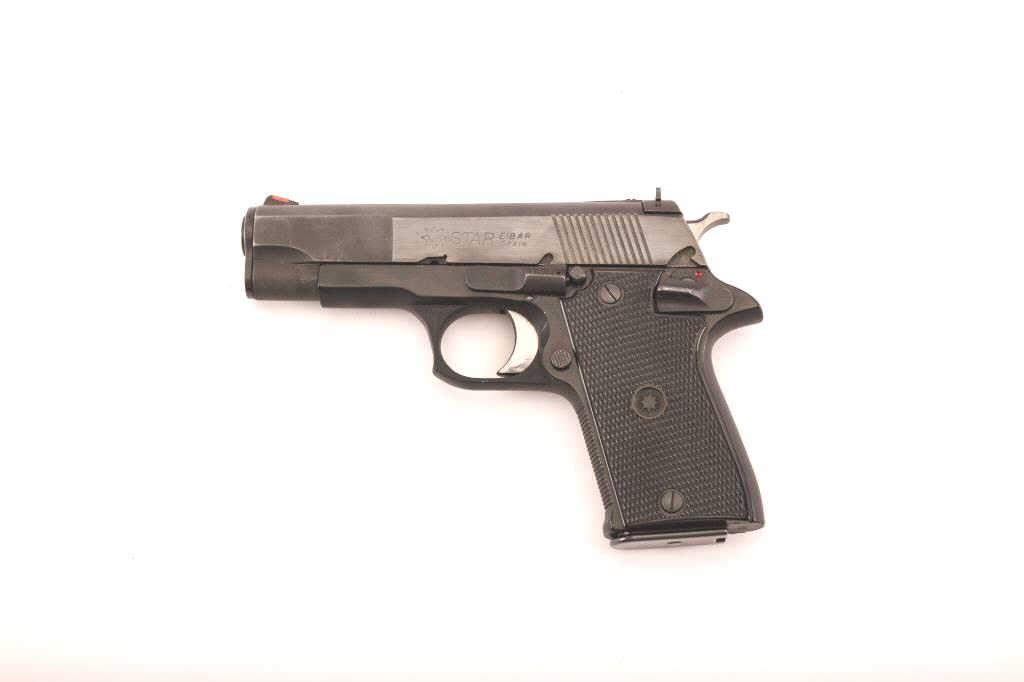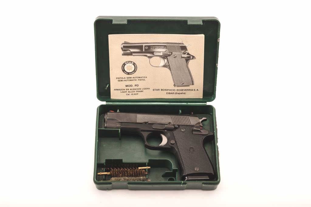 Star Model PD semi-automatic pistol, .45 ACP caliber, Serial #1902875. The pistol is in very good overall condition with a 4” barrel. The metal surfaces retain the majority of their blue finish with high point edge wearon the slide. The checkered plastic grips are in very good condition with sharp checkering and a checkered front strap. The bore is good, the action is crisp and the markings are sharp. The lot includes thefactory plastic hard case, one correct magazine and all associated packaging materials. Est.: $175-$350. (Modern/PPT).