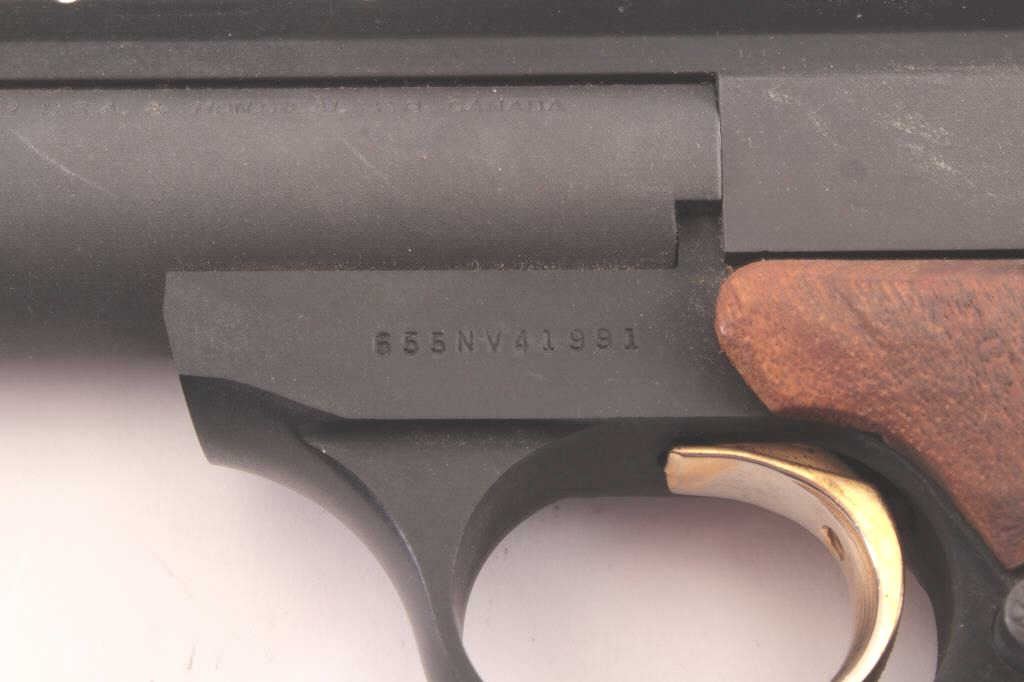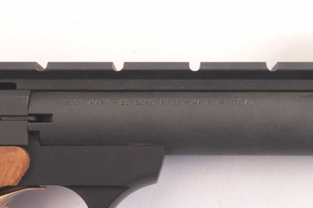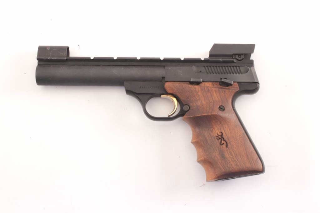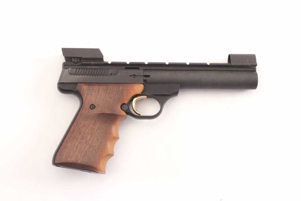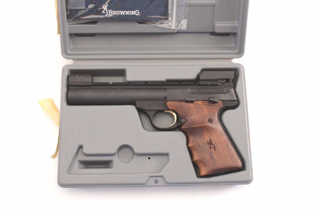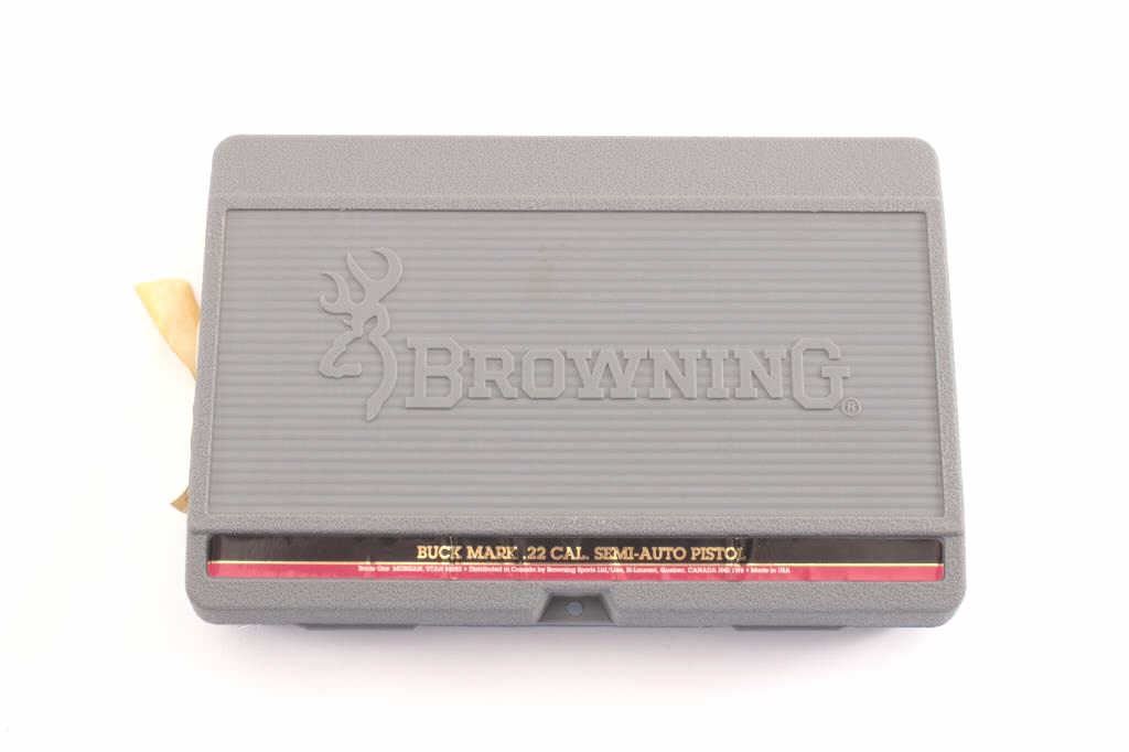 Browning Buck Mark Pro-Target semi-automatic pistol, .22 LR caliber, Serial #655NV41991. The pistol is in fine overall condition with a 5 ½” target barrel. The metal surfaces retain nearly all of their matte blue finishwith only light handling marks from carry and use. The hooded front sight is a blade while the rear is adjustable. The smooth wood finger grooved grips are in very good condition. The bore is good, the action iscrisp and the markings are sharp. The lot includes the factory plastic box with matching end label, one correct Browning marked magazine and all associated packaging materials. Est.: $250-$500. (Modern/PPT).