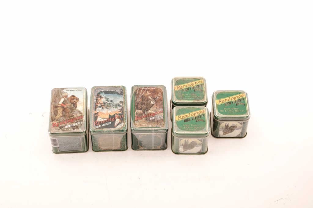 Lot of 6 Collector tins of Remington .22LR high velocity ammunition (3 tins @250 rounds/tin; 3 tins @400 rounds/tin); all sealed and in fine condition. Est.: $75-$150.