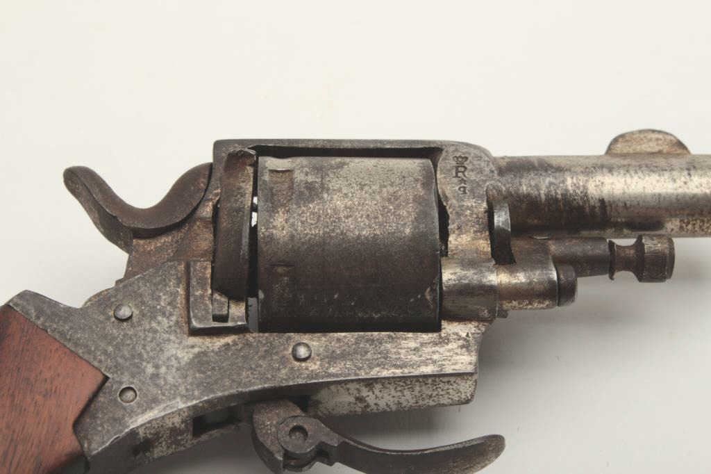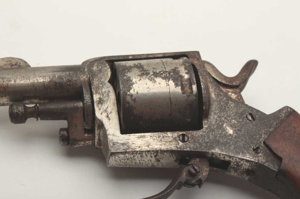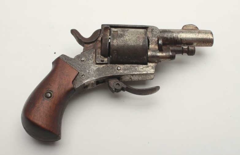 Belgian-proofed folding trigger revolver, .30 caliber, 2” barrel, nickel finish, wood grips, no visible S/N; overall fair condition with areas of nickel remaining; balance gone to a dark patina with scattered pinprickpitting, good grips, action not working. (Antique). Est.: $75-$150.