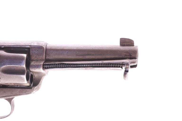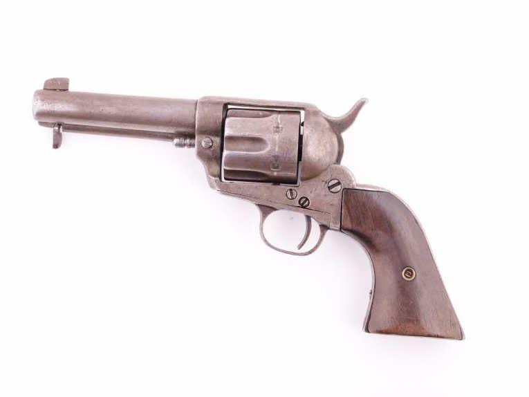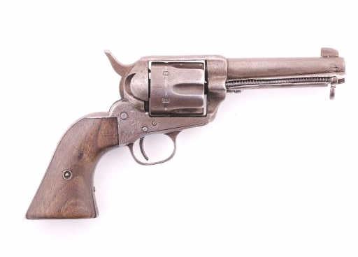 Un-marked copy of a Colt SAA revolver, possibly Mexican, .44 caliber, barrel cut down to 4.25” with ejector, grey/brown patina, wood grips, no visible S/N; fair to good condition as modified, working action,good grips. (Antique). Est.: $200-$400.