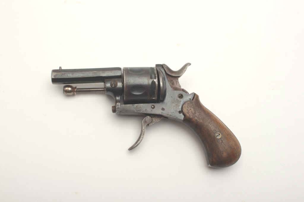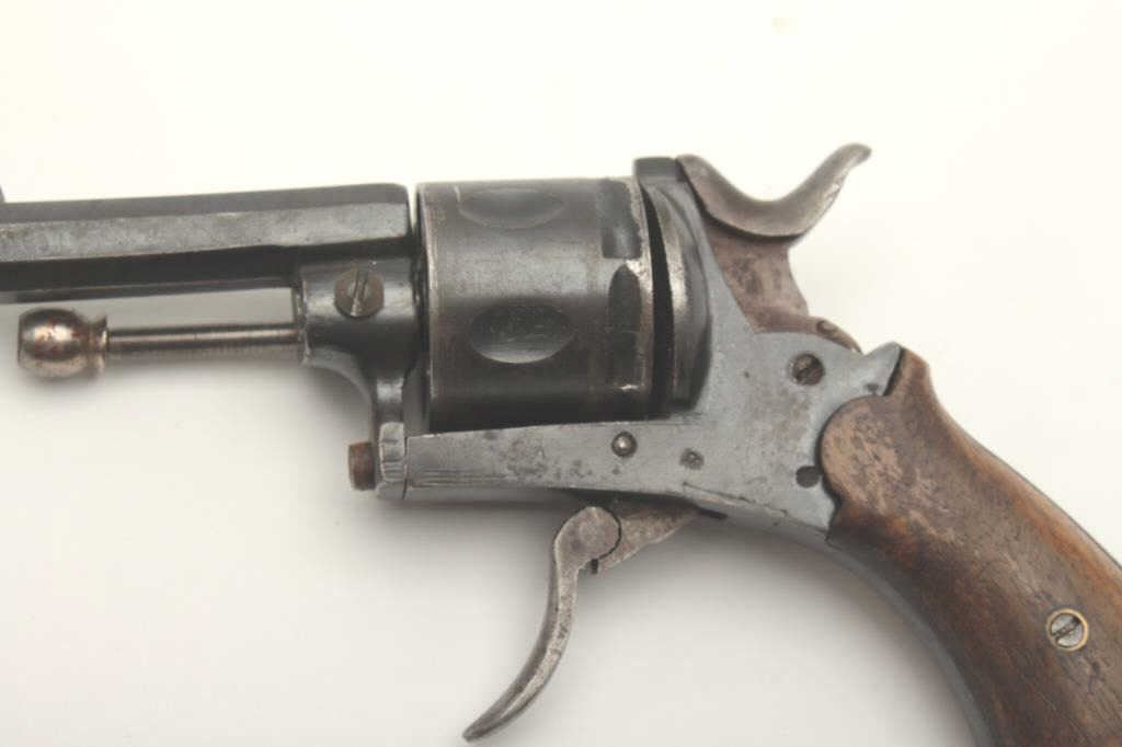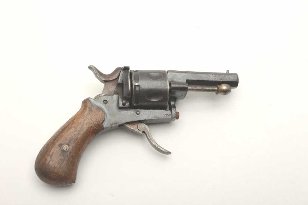 European folding trigger revolver, 7.65mm caliber, 2.25” octagon barrel, blued finish, wood grips, overall fair condition with considerable blued finish remaining, good wood grips, action not working.(Antique). Est.: $100-$200.
