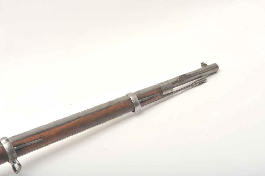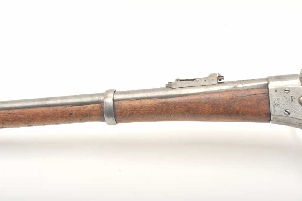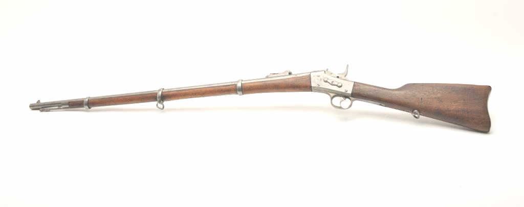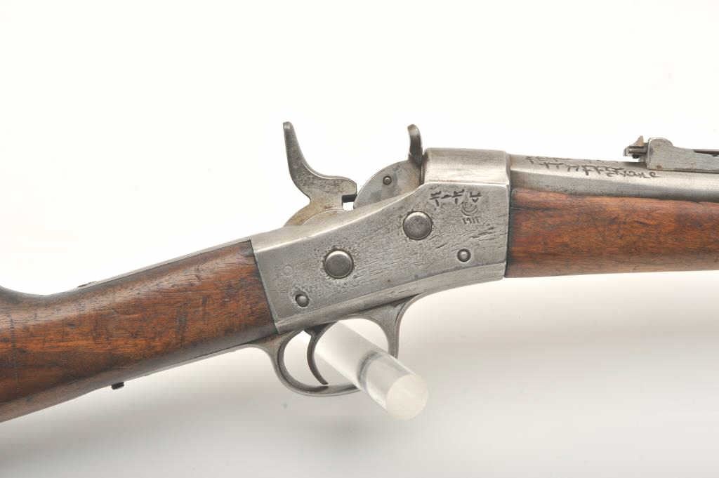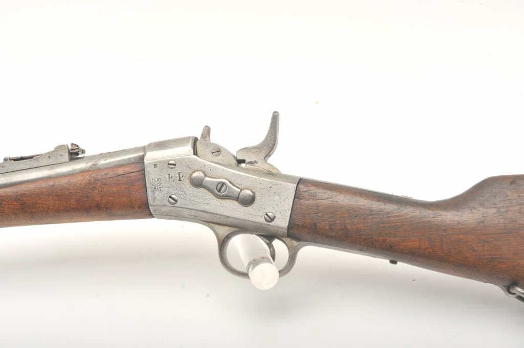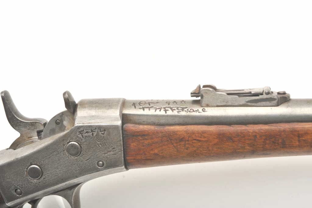 Remington Rolling Block single shot rifle, approximately .45 caliber, Serial #NSNV. The rifle is in good overall condition with a 35” barrel with a post front and a ladder tangent rear sights. The metal surfaces have gone to a silver/grey patina with areas of light surface rust. The rear of the action and receiver show numerous Turkish characters. The smooth wood stock shows heavy wear with mars, dents and some lossesalong the barrel. The stock features sling swivels and the butt ends with a smooth steel butt plate. The bore is fair, the action functions and the markings are legible. Est.: $300-$600. (C+R).