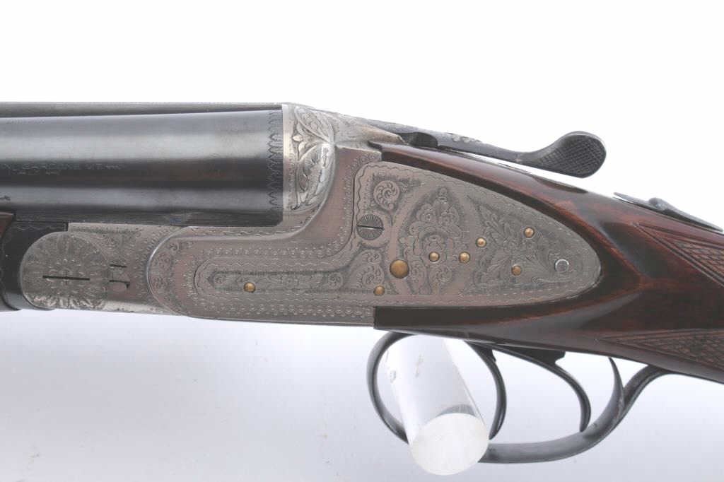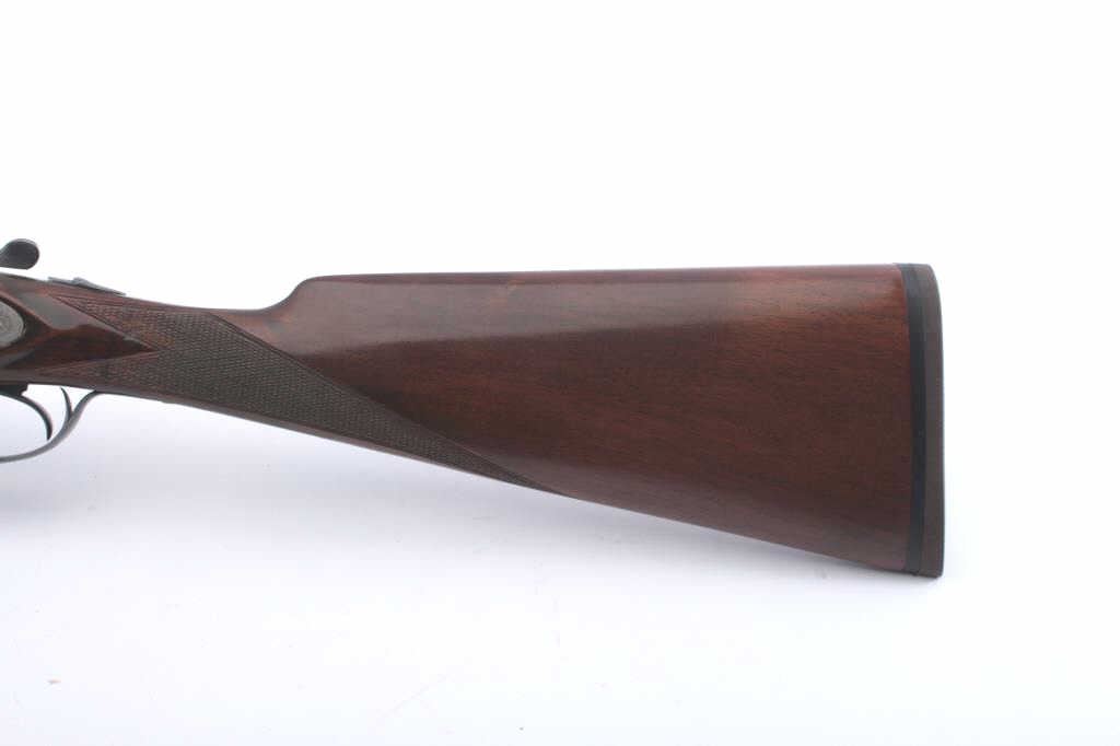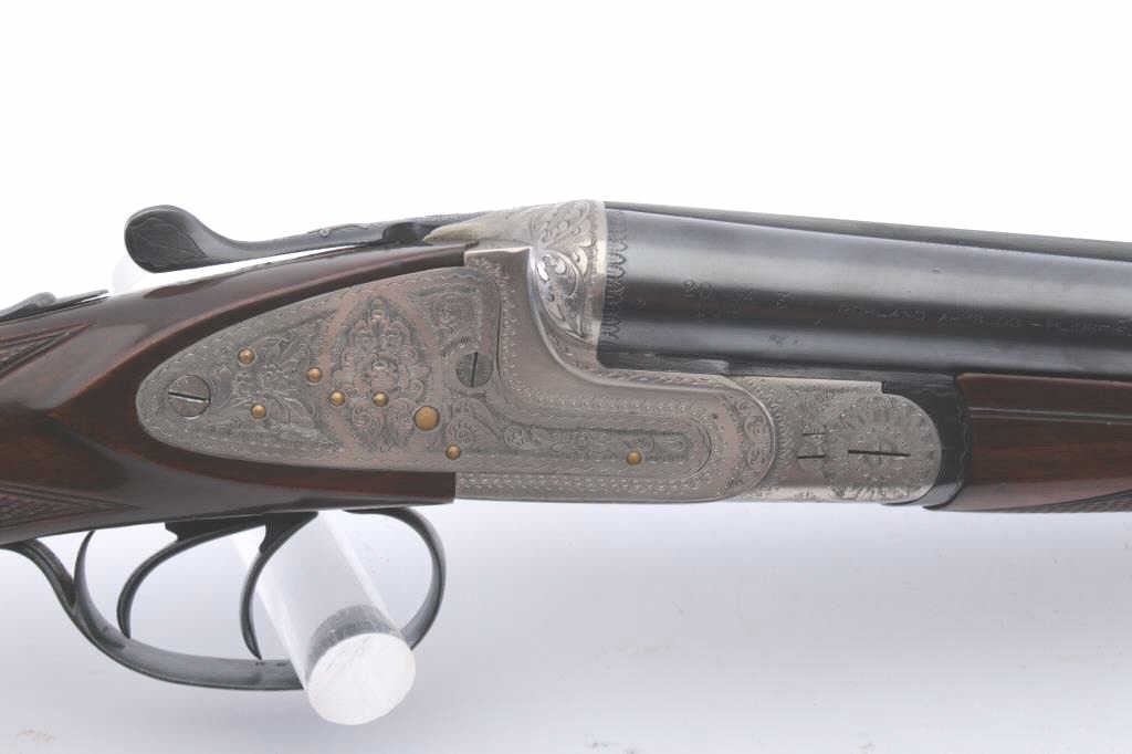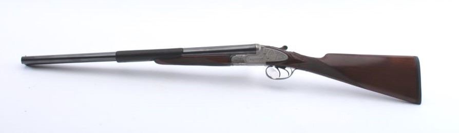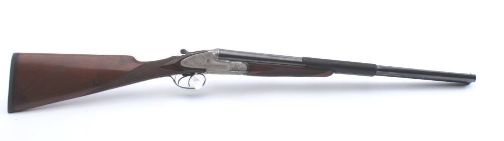 ): Italian Acciaio side by side shotgun, 20 gauge, Serial #7582. The shotgun is in very good overall condition with 22” barrels, a full-length filed rib and brass bead front sight. The barrels retain the majority oftheir blue finish and are marked for 3” shells. The receiver is coin finished and nicely floral engraved with double triggers and a tang mounted safety. The finely checkered wood stock has been broken at thewrist and repaired. The butt stock ends with a solid rubber recoil pad providing a 14 ½” LOP to the front trigger. The shotgun comes in a canvas covered luggage style case with leather trim. Est.: $300-$600. (Modern).