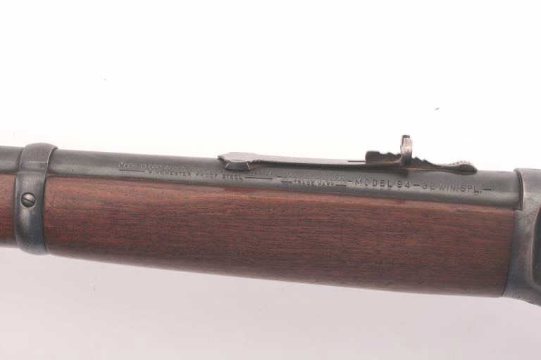 Winchester Model 94 lever action carbine, .32 Winchester Special caliber, Serial #1865306. The carbine is in good overall condition with a 20” and full-length magazine. The barrel and magazine tube retain the majorityof their blue finish with light wear at the muzzle and factory sling swivels added. The receiver retains a significant amount of its muted blue finish with edge wear and small scratches. The smooth wood stocks are ingood condition with small mars and handling marks. The butt stock ends with a checkered steel butt plate. The bore is good, the action is crisp and the markings are sharp on this nice 94 carbine manufactured in 1951.Est.: $400-$800. (C+R).