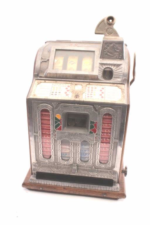 Interesting 1926 Mills 5 cent slot machine, converted by Rock-Ola to a vending machine to bypass gambling laws of the time; working at time of description. Est.: $1,250-$2,500.