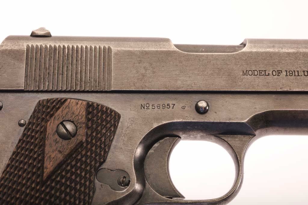 U.S. Property marked Colt Model 1911 semi-automatic pistol, .45 caliber, 5” barrel, blued finish, checkered wood grips, two-tone magazine, S/N 56957; overall very good condition showing majority of mixture of muted blued and brown patina with scattered light areas of pinprick pitting confined primarily to the left side of the pistol; crisp action, sharp markings, good bore and very good grips. (C&R/PPT). Est.: $1,250-$2,500.