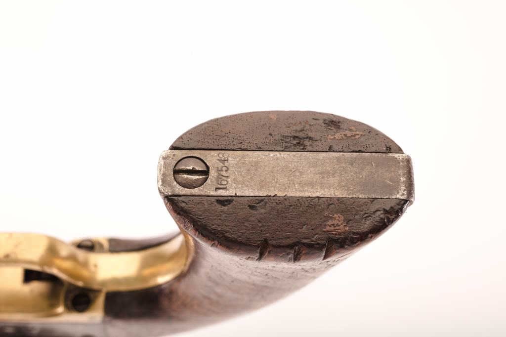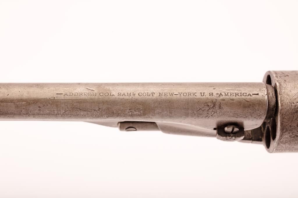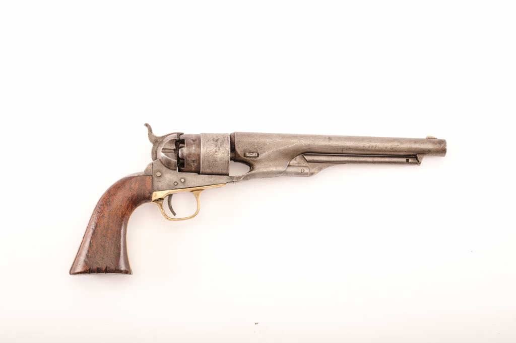 Colt Model 1860 Army percussion revolver, .44 caliber, 8” barrel, grey patina, wood grips, iron backstrap, brass trigger guard, S/N 167548; overall good condition with majority of cylinder scene remaining, crisp action,good markings and worn grips with three “hash” marks on bottom of right side grip. (Antique). Est.: $900-$1,800.