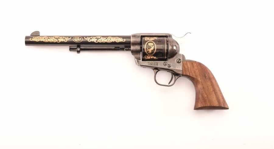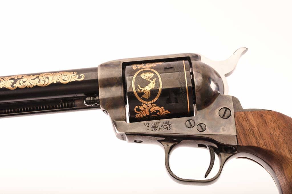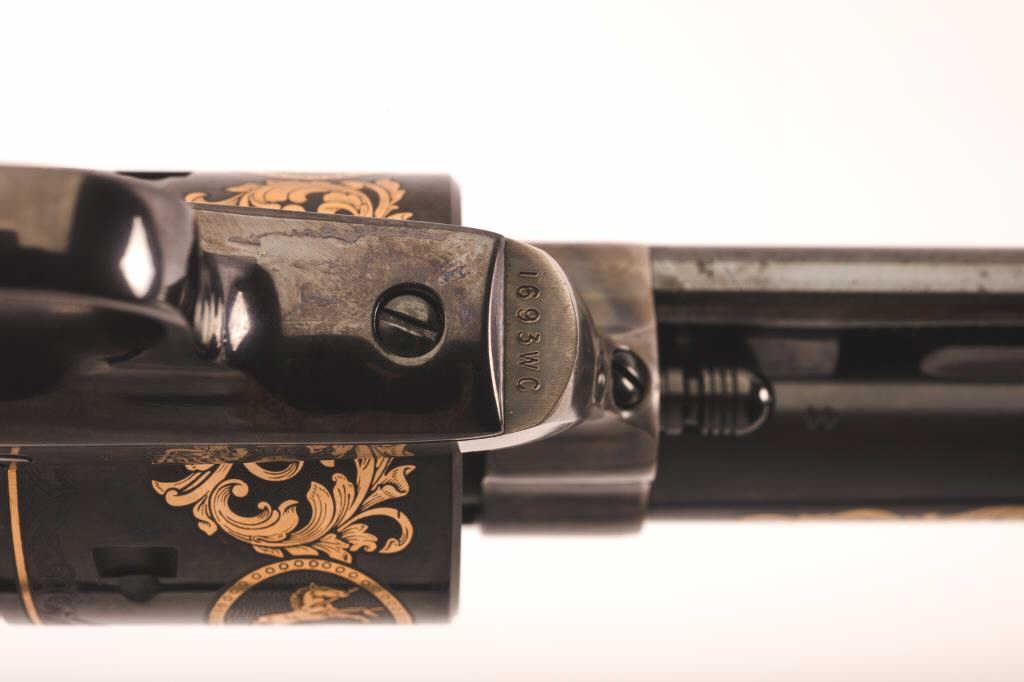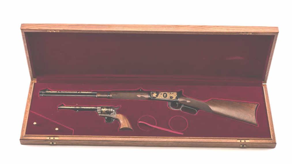 Oliver Winchester Commemorative 2-gun Set in red velvet lined and fitted wood presentation case with brass plaque on lid and two interior Commemorative medallions; one gun is a Winchester Model 94 lever action carbine,.44-40 Win. caliber, 20” barrel, blued finish with gold color decoration, deluxe checkered wood stocks with beautiful graining, S/N 1693 W.C. in overall like new condition; other gun is a Colt SAA revolver, .44-40caliber, 7.5” barrel, blued and case hardened finish with gold color decoration, smooth wood grips, S/N 1693WC, also in like new condition with hang tag. A well-recognized 2-gun Commemorative Set. (Modern/PPT). Est.: $1,400-$2,800.