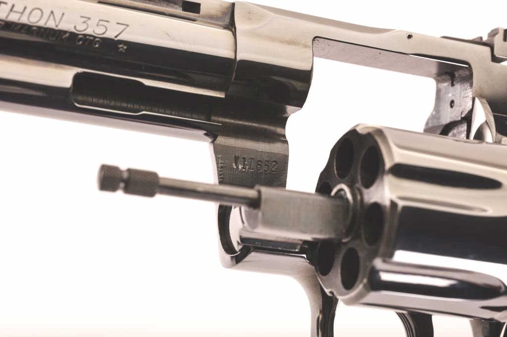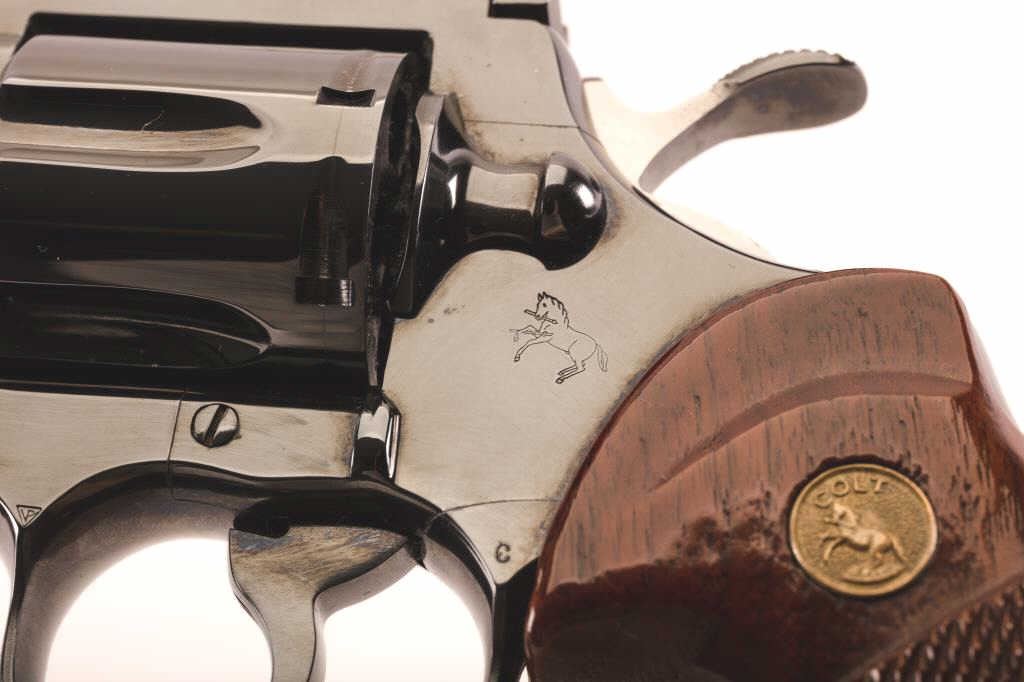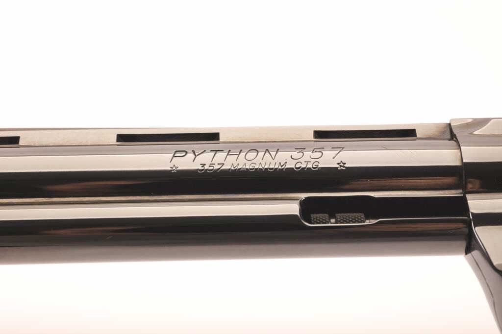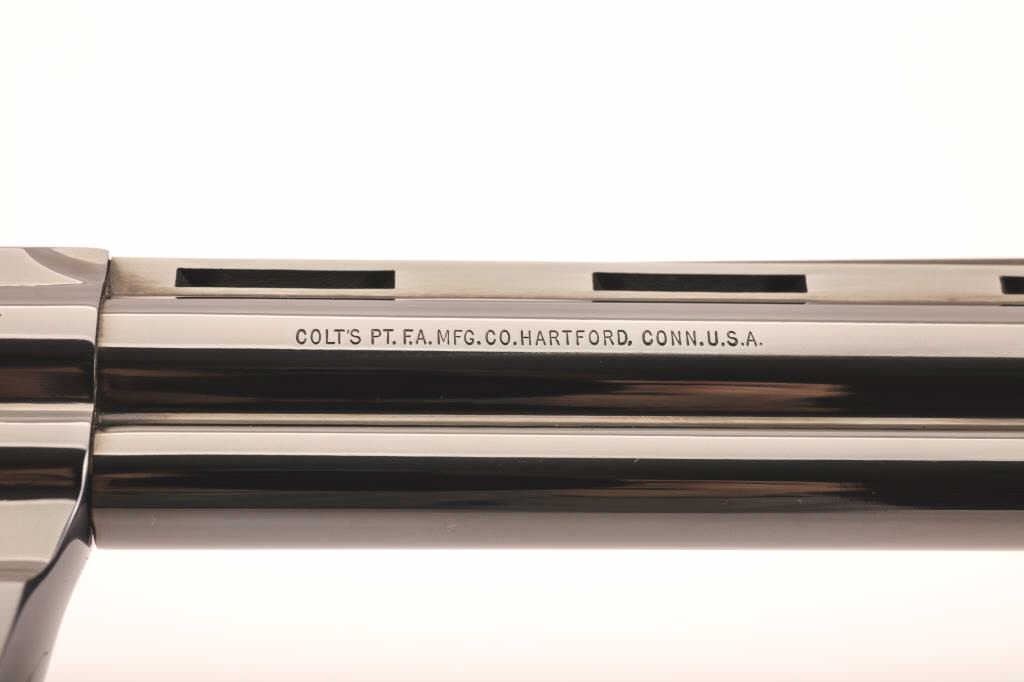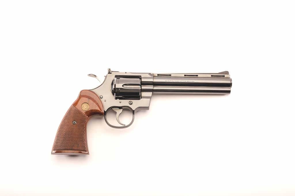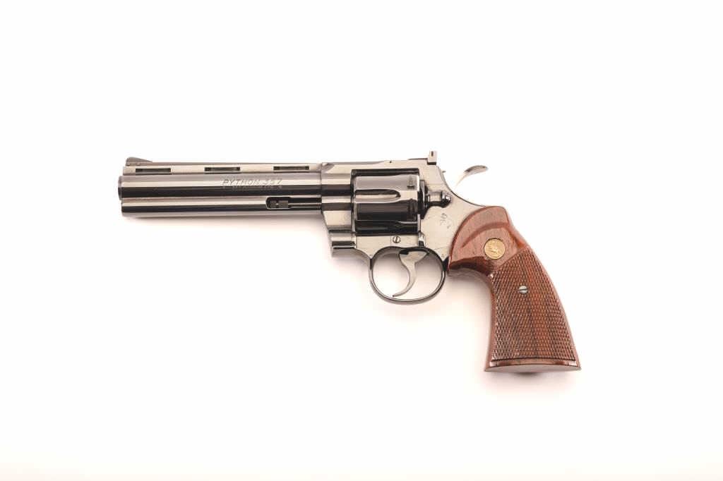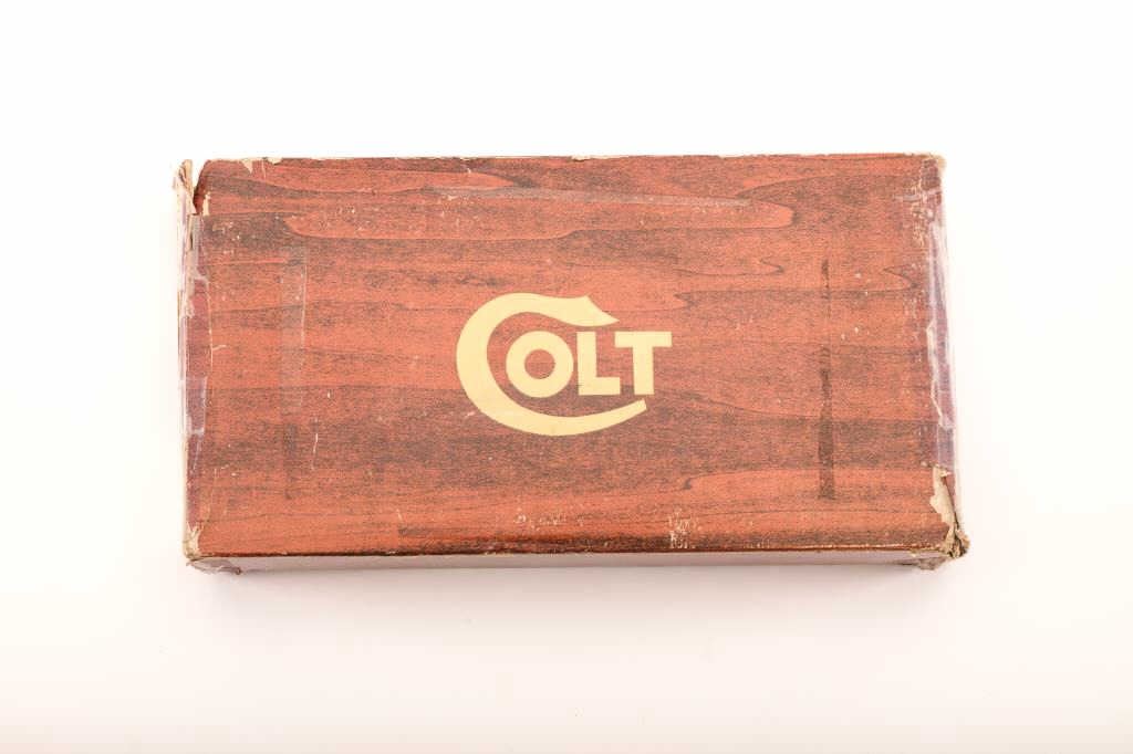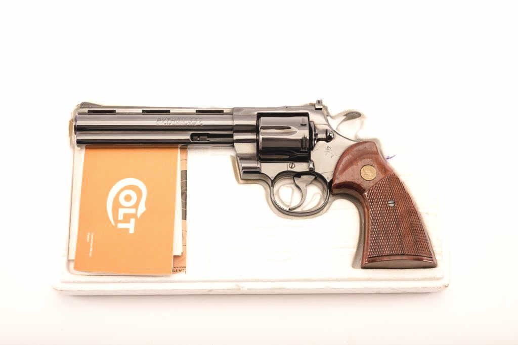 Colt Python revolver, .357 Magnum caliber, Serial #V11652. The pistol is in excellent to nearly mint overall condition in the factory cardboard box. The pistol features a 6” barrel with a full-length ventilated rib, ramp front and adjustable rear sights. The pistol retains nearly all of its blue finish with a faint drag line on the cylinder. The checkered wood gold medallion grips are in excellent condition with sharp checkering.The pistol comes in the factory cardboard box with a non-matching label. However, the consignor indicates that he purchased the gun as new from a dealer in the box. The lot includes all associated packaging materialsand manual. Est.: $2,000-$4,000. (Modern/PPT).